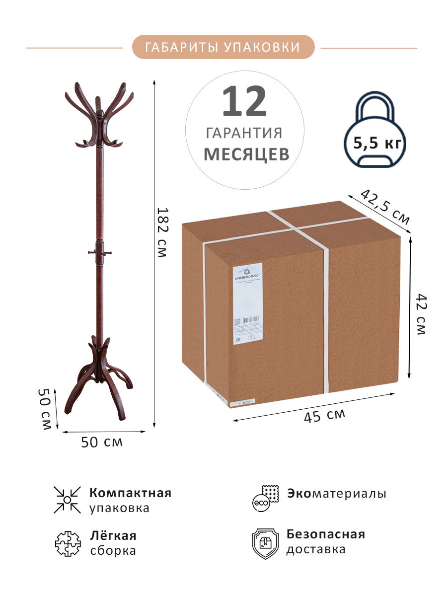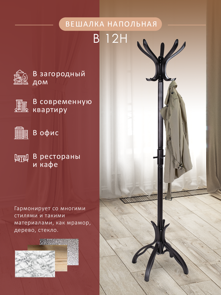 Вешалка В12Н - классическая элегантная вешалка для верхней одежды из массива натурального дерева в кабинет, приемную, офис, кафе. Очень часто эту вешалку используют и в домашних интерьерах - в прихожих, домашних кабинетах и даже в спальнях. Вешалка оснащена пятью крючками для верхней одежды, пятью крючками для головных уборов. Кроме того в сумочной зоне есть четыре крючка для сумок и зонтов.Массив дерева – универсальный и привычный материал в мебели, за счет своих свойств элементы интерьера из натурального дерева всегда уместны в интерьере.Вешалка компактно упакована и для ее транспортировки не требуется прибегать к помощи грузового такси, ее можно транспортировать даже в общественном транспорте. При этом она легко собирается – все элементы просто скручиваются между собой. За счет разноса опор вешалка устойчива, а толщина крючков позволяет уверенно пользоваться вешалкой даже в заведениях с большой проходимостью.Вешалка В12Н – рациональный выбор для тех, кто предпочитает предметы интерьера из натуральных материалов в классическом стиле.