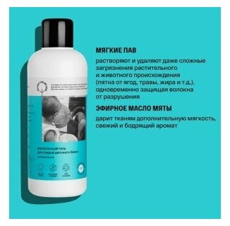 Биоразлагаемая формула с заботой о здоровье и экологии: безопасен для стирки белья новорождённых детей.