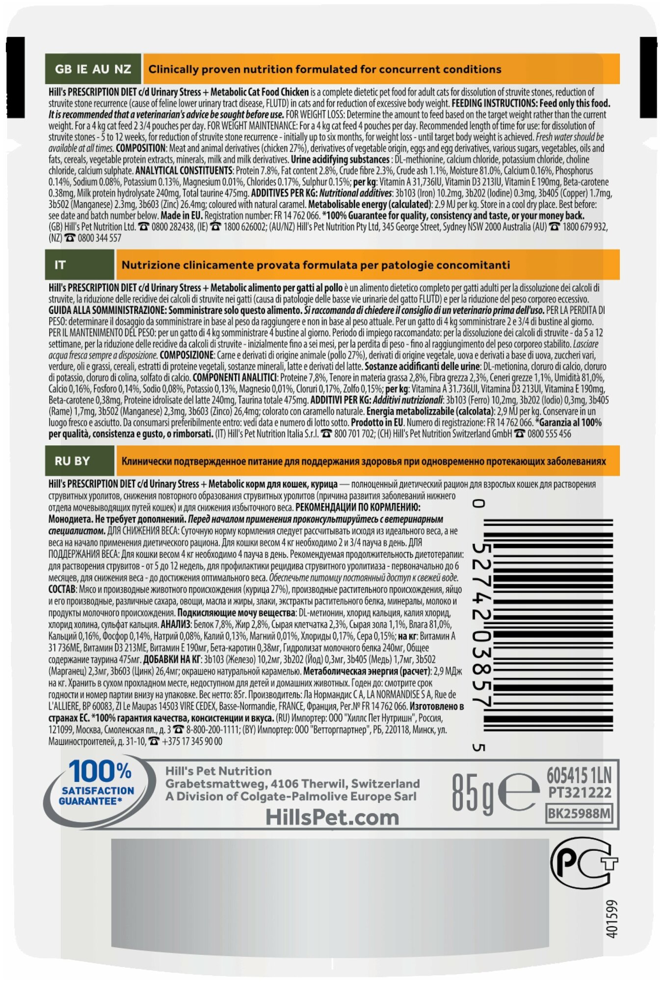 На начальном этапе у кошек с любым типом заболеваний нижних отделов мочевыводящих путей, в том числе идиопатическим циститом кошек (ИЦК), кристаллурией и/или уролитиазом любого генеза, уретральными пробками. Для растворения стерильных струвитных уролитов. Для долговременного использования для кошек, склонных к идиопатическому циститу кошек (ИЦК), к образованию струвитных кристаллов и уролитов, кристаллов и уролитов кальция оксалата и кальция фосфата (снижение появления и частоты рецидивов), к формированию уретральных пробок (почти всегда вызванных кристаллами струвита или кальция фосфата) и кошкам с избыточным весом или ожирением. А также для поддержания веса после его снижения. Влажный диетический корм Hill's PRESCRIPTION DIET c/d Urinary Stress + Metabolic для взрослых кошек в форме кусочков в соусе с курицей с научно разработанной формулой для контроля над стрессом и избыточным весом. Стресс и избыточный вес – одни из основных факторов риска развития заболеваний нижних мочевыводящих путей у кошек (англ. FLUTD)1. Рацион доступен в удобной для порционного кормления упаковке пауч. Ключевые преимущества: • Способствует снижению массы тела на 11% за 60 дней 2; • Содержит L-триптофан и гидролизат молочного белка для контроля над стрессом; • Содержит контролируемый уровень магния, кальция и фосфора для снижения образования строительных блоков для кристаллов и камней; • Способствует поддержанию оптимального уровня pH мочи, что помогает растворять камни в мочевом пузыре и предотвращает их повторное образование; • Содержит высокий уровень омега-3 жирных кислот, которые помогают разорвать цикл воспаления.