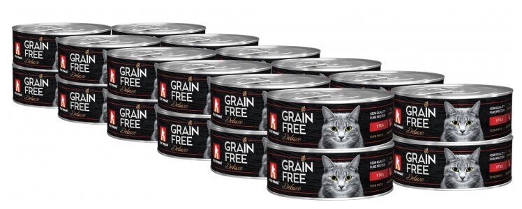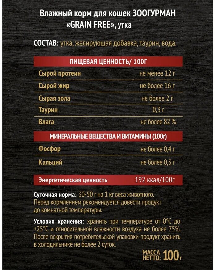 Влажный корм для кошек ЗООГУРМАН GRAIN FREE. Беззерновой корм суперпремиум класса. Основой корма и главным источником белка является свежее мясо исключительного качества. Все ингредиенты корма являются полностью натуральными, без добавления гормонов, искусственных консервантов, ароматизаторов. Для взрослых кошек.