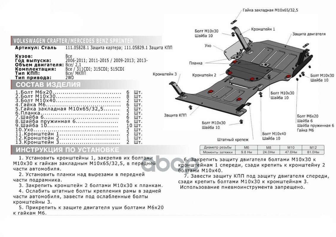 | Комплектация | защита - 1 шт., комплект крепежа, инструкция по установке, упаковка |