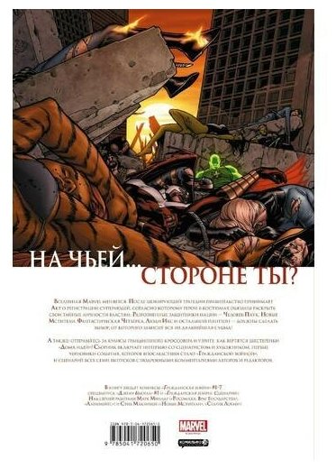 В книгу входят комиксы "Гражданская война" #1-7, спецвыпуск "Дэйли бьюгла" #1 и "Гражданская война: сценарий". Над серией работали Марк Миллар ("Росомаха: враг государства", "Алтимейтс") и Стив Макнивен ("Новые Мстители", "Старик Логан").