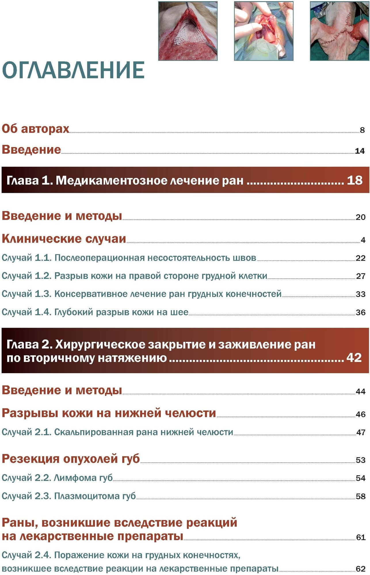 Первая глава - это обзор методов консервативного лечения ран. Вторая глава посвящена рассмотрению хирургических методов, особенно хирургической обработке ран как основополагающем этапе лечения. В третьей и четвертой главе рассматриваются самые распространенные методы пластической хирургии: закрытие дефектов кожными лоскутами (глава 3) и кожными имплантатами (глава 4).