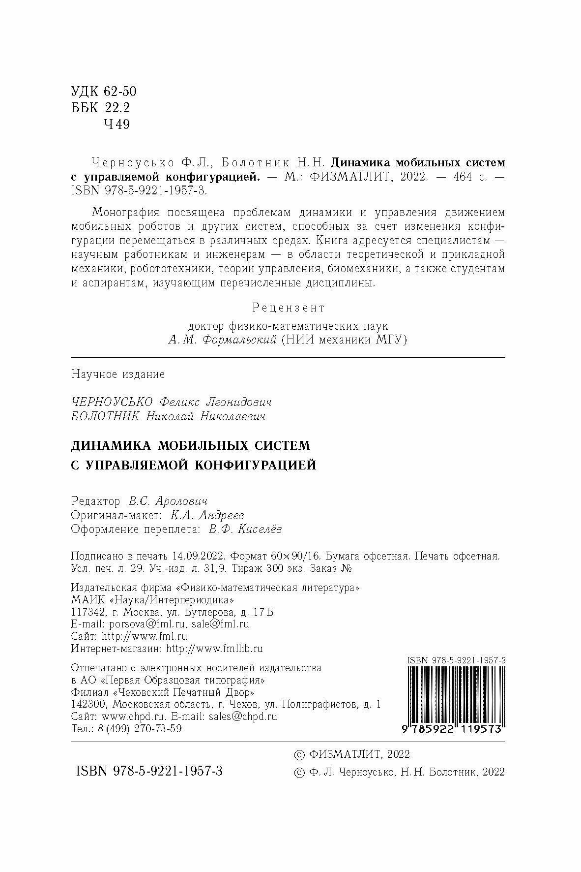 Динамика мобильных систем с управляемой конфигурацией (Черноусько Феликс Леонидович, Болотник Николай Николаевич); Физматлит, 2022