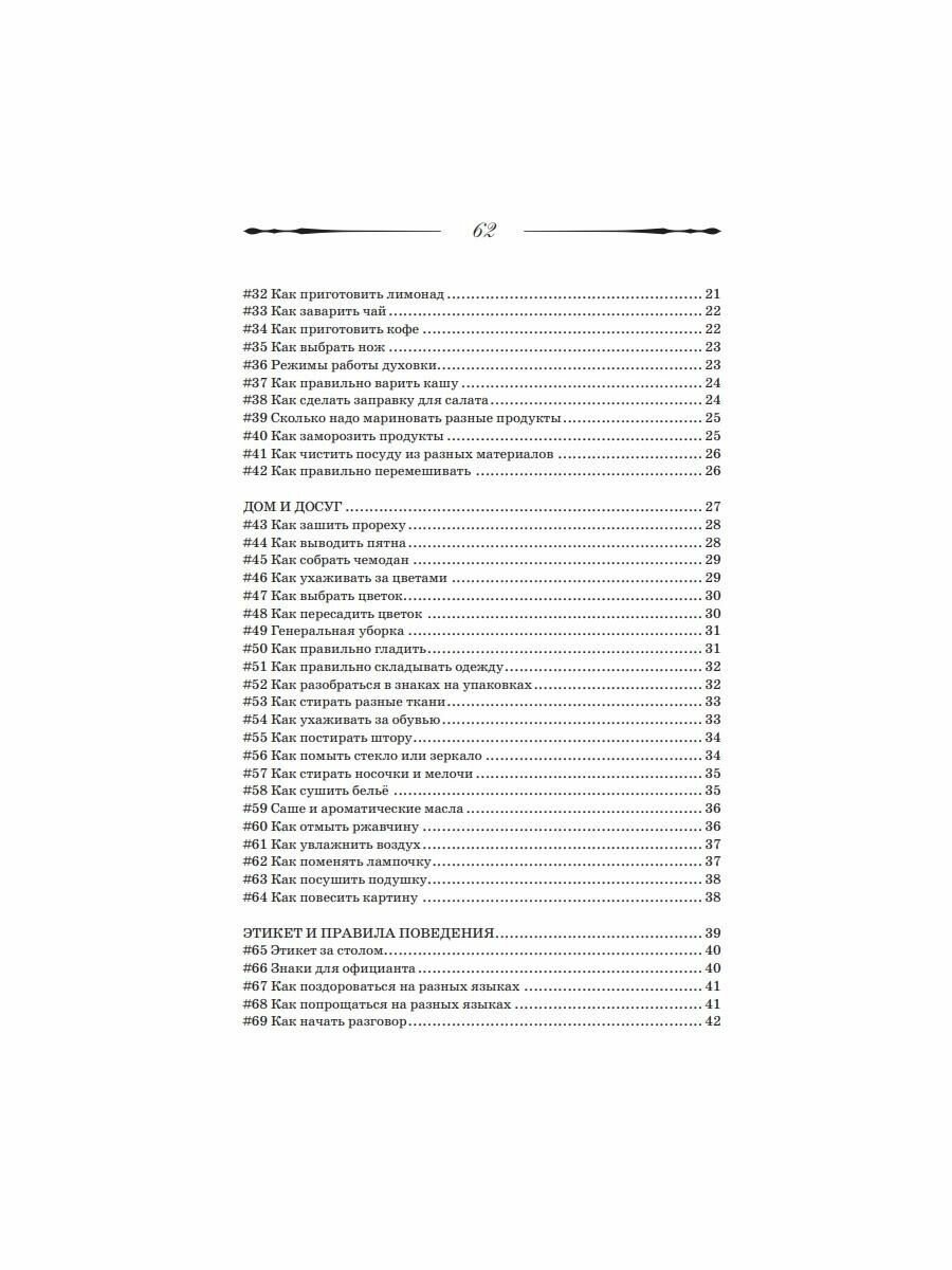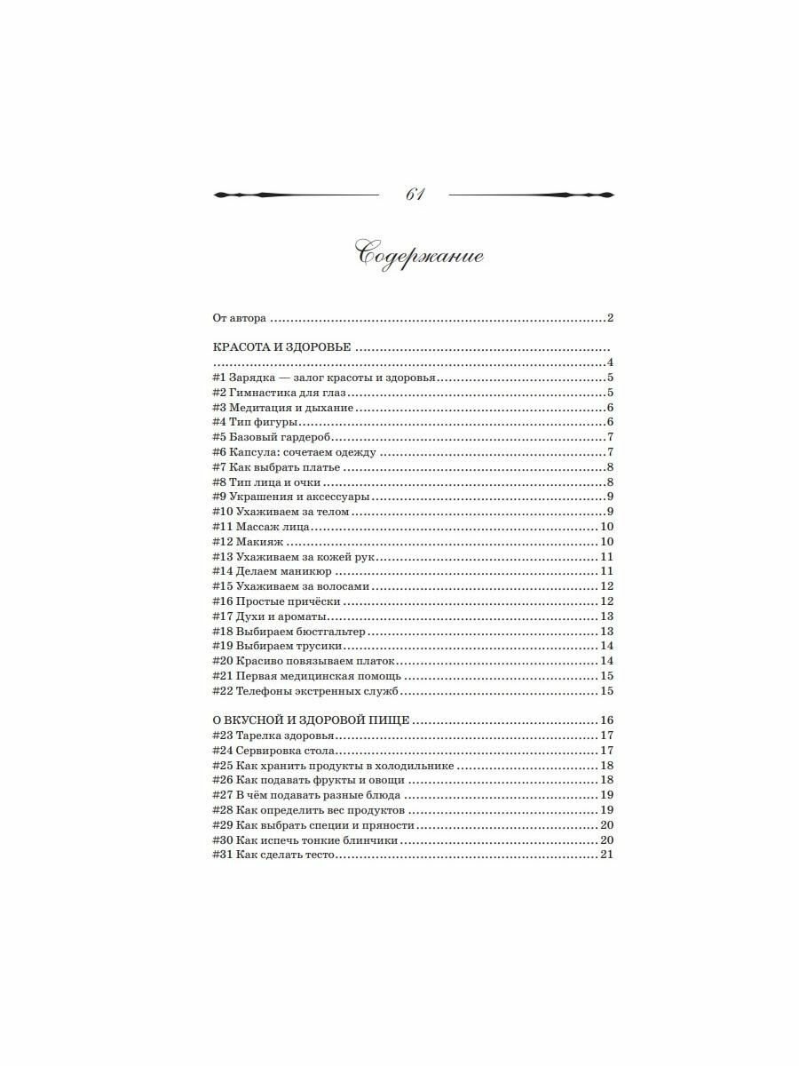 Книга состоит из 5 больших разделов: 1. Дом; 2. Красота и здоровье; 3. О вкусной и здоровой пище; 4. Общение и этикет; 5. Подарки и творчество.