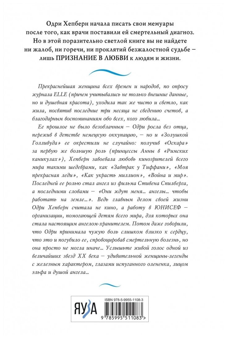 Эта книга - прощание прекрасной женщины и великой актрисы. Она знает, что умирает и решает рассказать о своей жизни, о людях, с которыми она встречалась, которых любила, о работе послом ЮНИСЕФ. Одри находит множество добрых слов, она искренна и убедительна. Грустно, оттого, что она уходит. Но счастье, что она жила на этой земле.