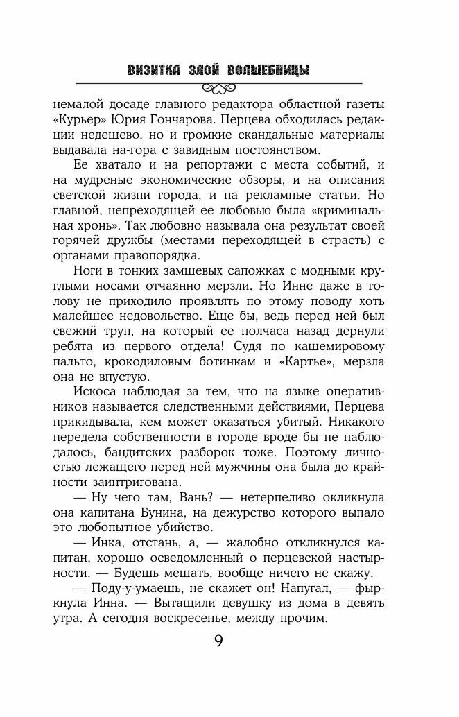 «Визитка злой волшебницы» - история, которая смогла увлечь меня своим простым слогом. Но если ждать от книги чего-то невероятного, то можно разочароваться. Главные герои оказались совсем никакими, от них только устаёшь. Меня больше заинтересовали даже второстепенные персонажи, возникло ощущение, что они и двигали весь сюжет. Финал оказался предсказуем, а каких-то новых фишек тут не наблюдается.