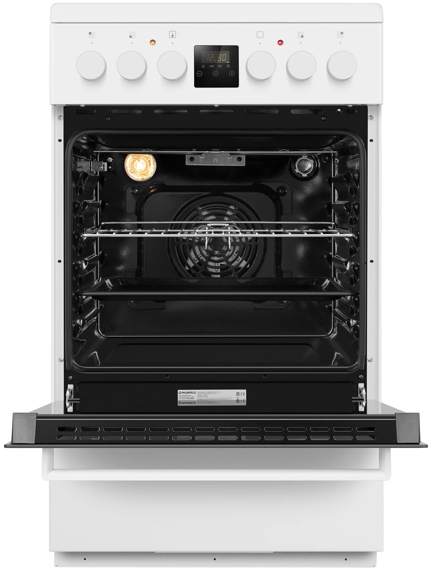 Духовой шкаф объемом 59 л имеет шесть рабочих режимов, включая гриль и конвекцию. На внутренней стороне дверцы есть три стеклянных слоя, которые обеспечивают безопасность эксплуатации. Устройство оснащено таймером и звуковым оповещением.