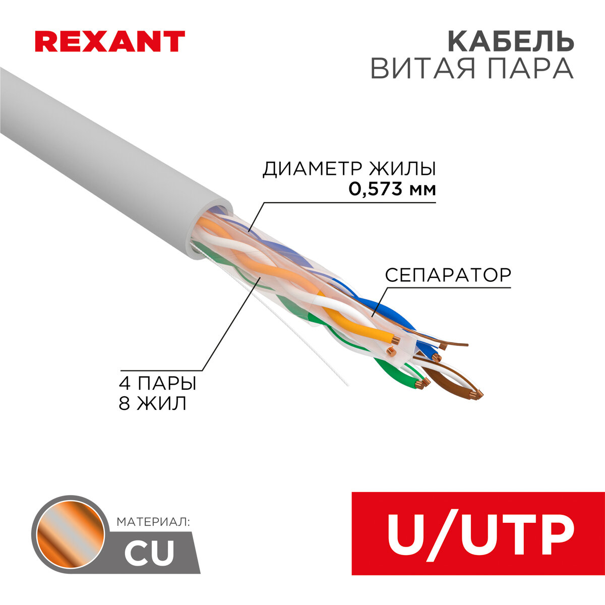 Кабель витая пара U/UTP 6 кат. 4 пары Rexant 01-0067