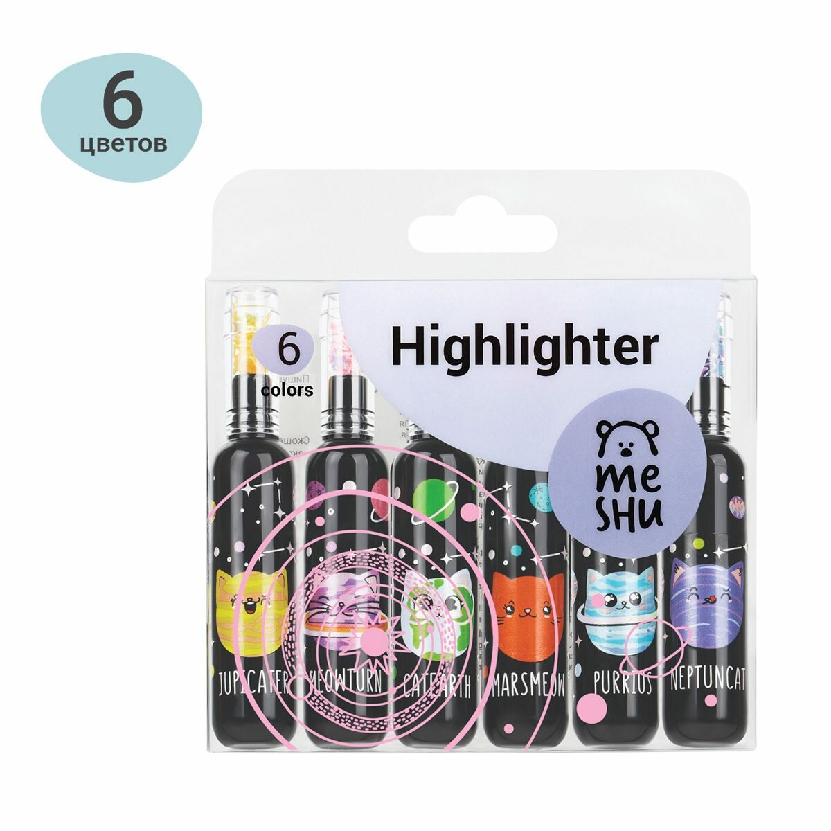 Набор текстовыделителей MESHU "Meowspace" 6 цв. неоновые цвета 1-5 мм ПВХ бокс с европодвесом (MS_76375)