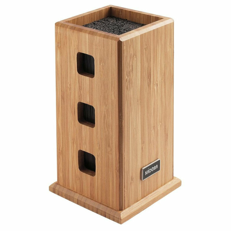 Nadoba производит высококачественные кухонные инструменты и аксессуары, что подтверждается длительным сроком гарантии. Блок для хранения ножей необходим в каждом доме. Вы останетесь довольны его качеством, эргономичностью и функциональностью. Внутри подставки находится наполнитель из полипропиленовых волокон, которые позволяют ножам избежать соприкосновения друг с другом. Благодаря этому лезвия дольше остаются острыми. Наполнитель легко моется.