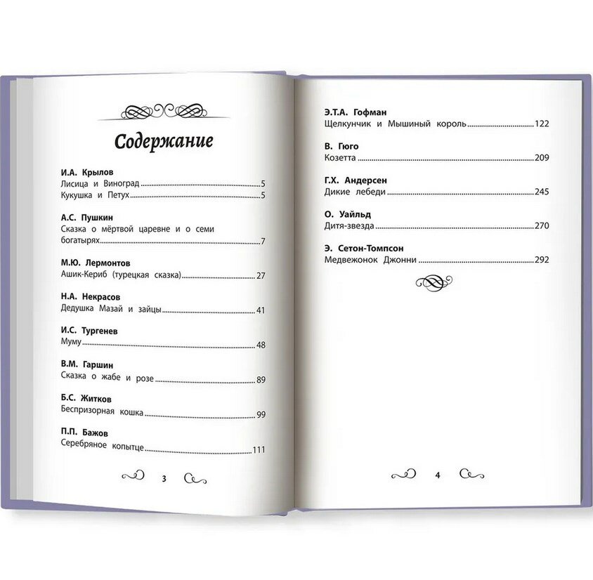 В эту хрестоматию вошли басни И.А. Крылова, сказки А.С. Пушкина и М.Ю. Лермонтова и произведения других русских классиков: Н.А. Некрасова, И.С. Тургенева и В.М. Гаршина. Здесь вы найдёте сказ П.П. Бажова, рассказ Б.С. Житкова, а также прозу зарубежных авторов: Э.Т.А. Гофмана, В. Гюго, Г.Х. Андерсена, О. Уайльда и Э. Сетон-Томпсона.
