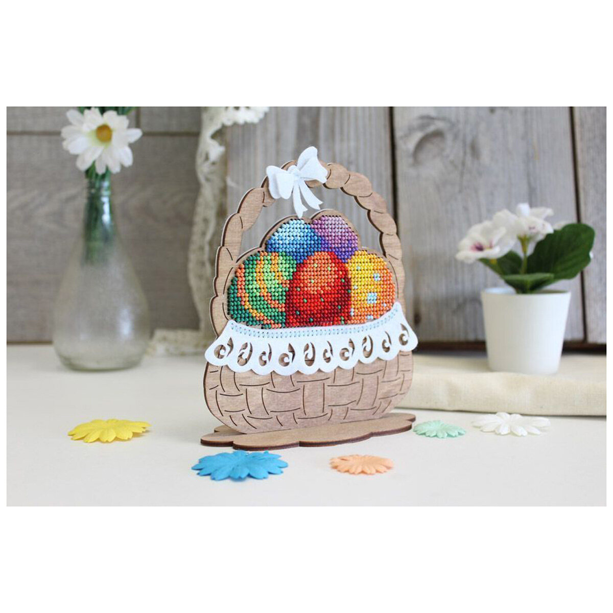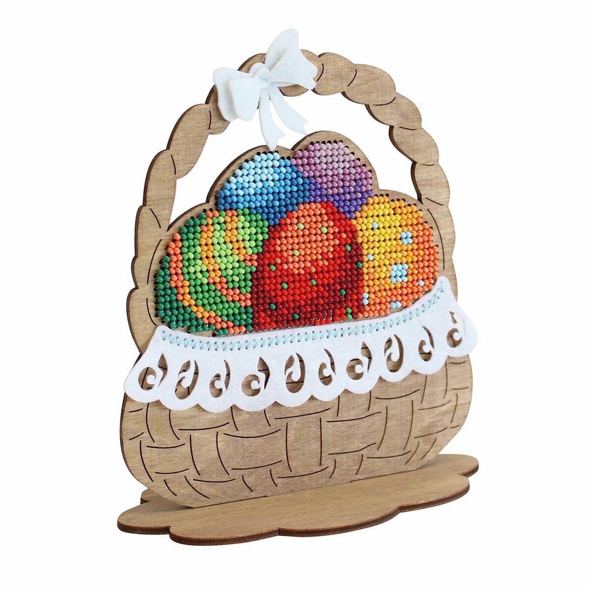 Создайте оригинальный сувенир с вышивкой бисером 'Пасхальная корзинка'. Для вышивки не потребуются даже пяльцы, достаточно владеть техникой 'косой стежок' и точно следовать инструкции. На фанере уже нанесена перфорация, поэтому стежки получатся аккуратными, с одинаковым наклоном. Готовый сувенир украсит рабочий стол, гостиную или станет прекрасным подарком. Заготовка поставляется в разобранном виде, схема сборки прилагается в инструкции. Основа из фанеры не требует обязательной обработки, но при желании отдельные детали можно предварительно покрыть лаком или расписать акриловыми красками. Внимание: дождитесь, пока покрытие полностью высохнет, чтобы не повредить роспись и не испортить вышивку. В наборе: перфорированная тонированная основа из фанеры 3 мм (состоит из основания и подставки), белый фетр для обработки изнаночной стороны (толщина 1 мм), декор из фетра 3 шт. – салфетка и 2 бантика, бисер Preciosa, швейные нити, игла, двухцветная символьная схема, инструкция. Количество цветов: 14. Размер готового сувенира: 14х13х6 см.