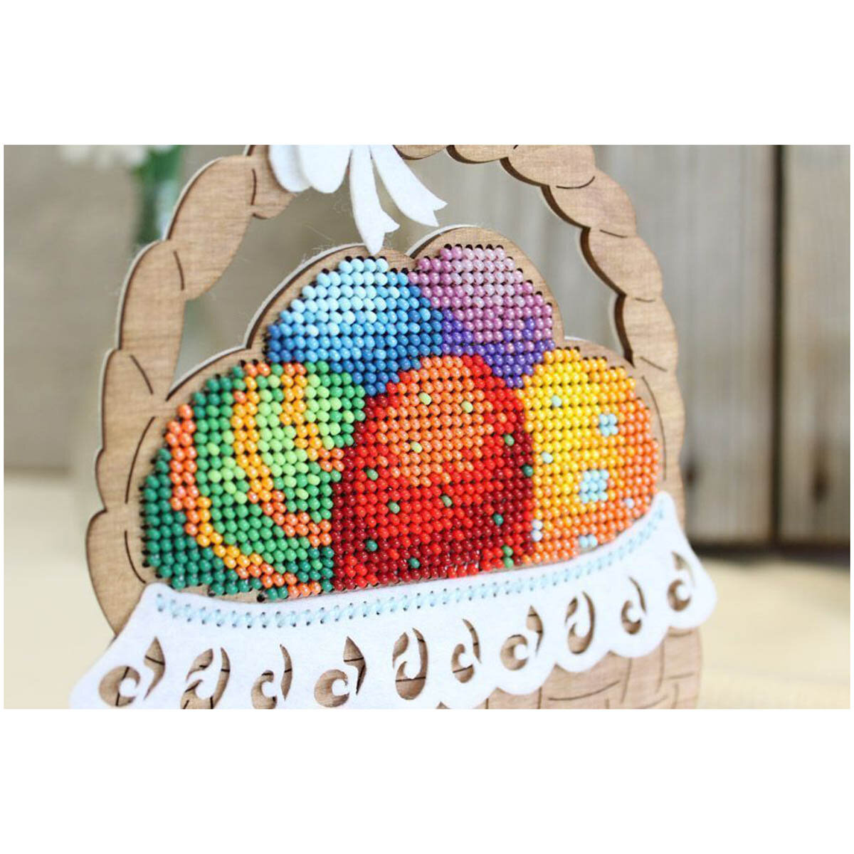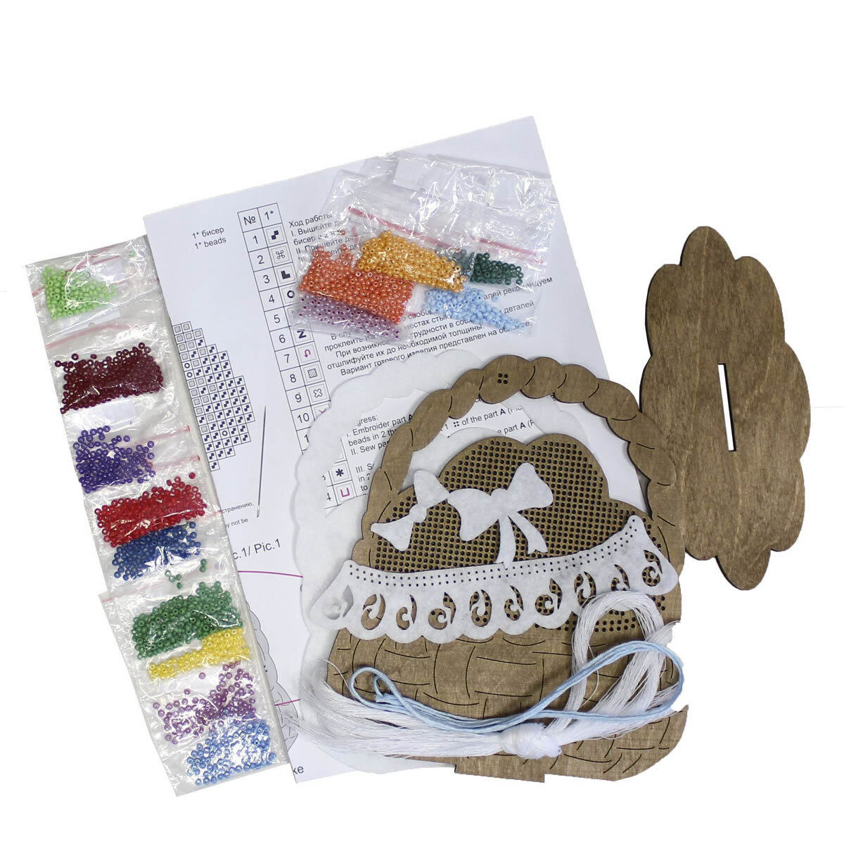| В набор входит | тонированная перфорированная деревянная основа, подставка, бисер Preciosa 14 цветов, белый фетр для обработки изнаночной стороны, декор из фетра 3 шт - салфетка и 2 бантика, швейные нити, игла, двухцветная схема и руководство по вышиванию |