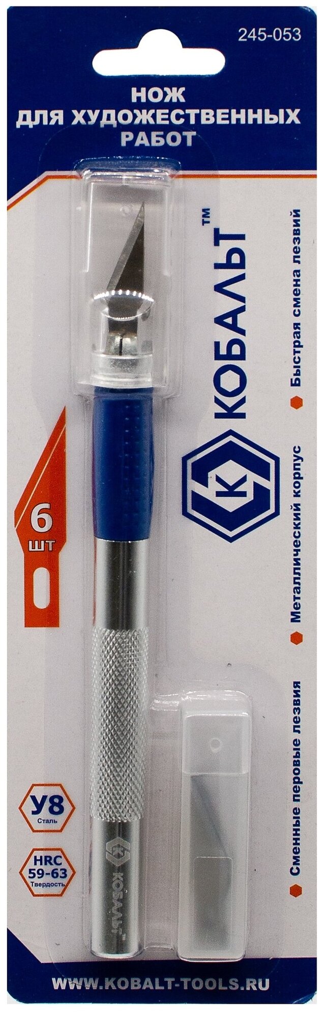 Нож для художественных работ КОБАЛЬТ предназначен для аккуратного точного криволинейного резания шпона, пленок, тонкого пластика, ткани, кожи, резины, картона, бумаги при выполнении различных декоративных работ. Идеален при декорировании мебели, интерьеров, одежды, изготовления сувенирной продукции, витражей, декупажа, детского творчества и моделизма. Металлическая рукоятка с цанговым зажимом имеет резиновую муфту и аккуратную накатку на корпусе для удобства пользования. В комплекте 6 одинаковых треугольных лезвий из углеродистой инструментальной стали.