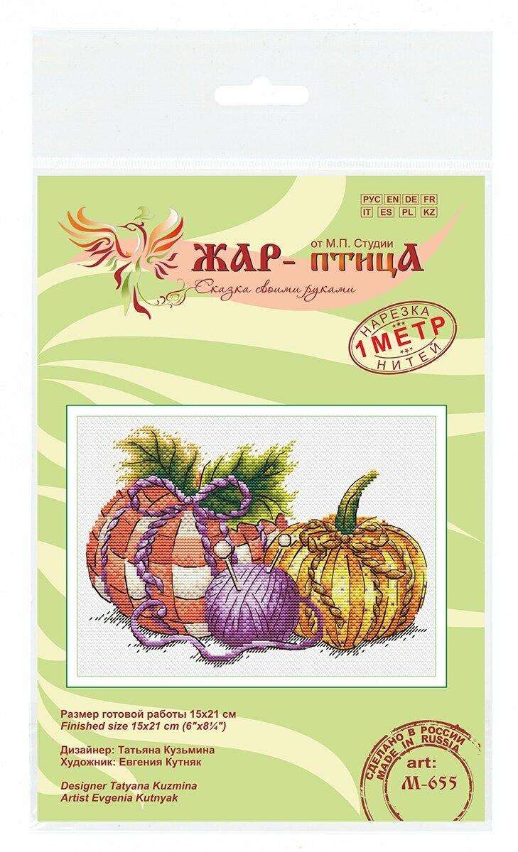 Набор для вышивания "М. П. Студия" серия М-655 «Рукодельные тыквы». В состав набора входит все необходимое для работы: хлопчатобумажная льняная канва 14 каунта, нитки мулине ПНК им. Кирова 23 цветов, разобранные на органайзере, игла, схема и руководство по вышиванию. Частичная зашивка.