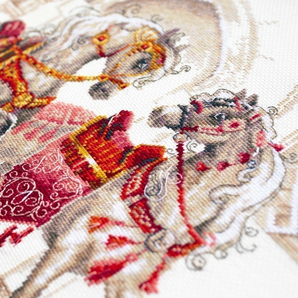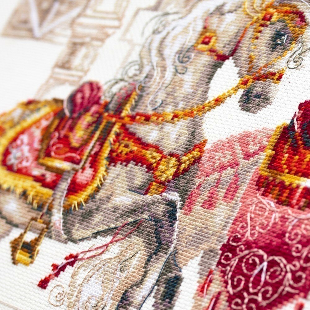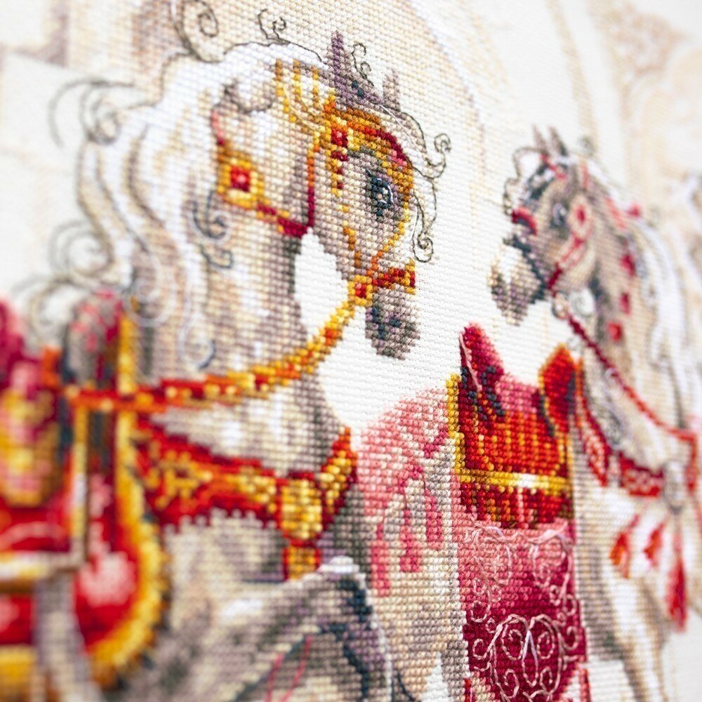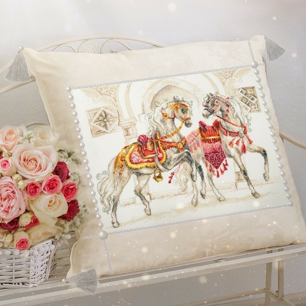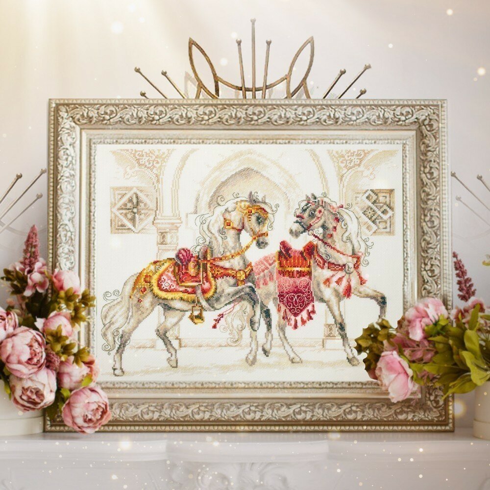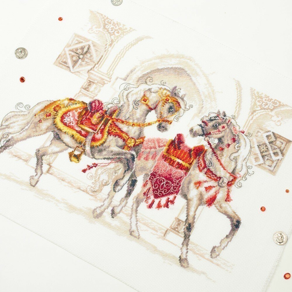 Набор для вышивания крестом: 320-425 Королевские скакуны. В комплекте: канва Аида 14 молочная, ZWEIGART, мулине DMC, цветная символьная схема, игла, инструкция. Рамка, паспарту в комплект не входят - представлены как образцы готовых работ!