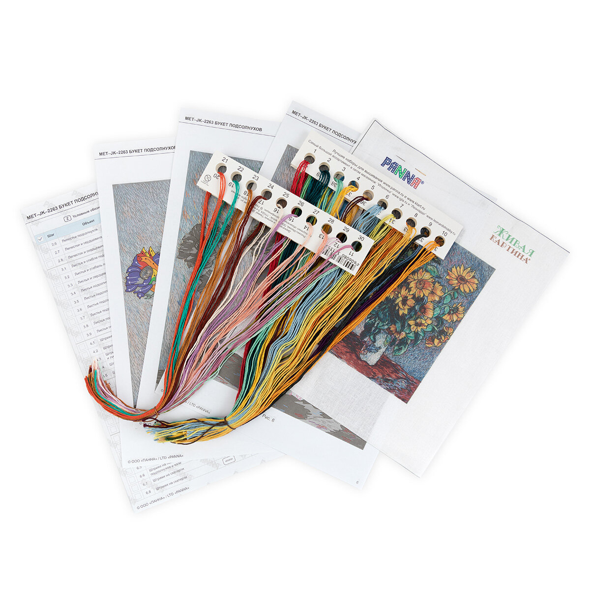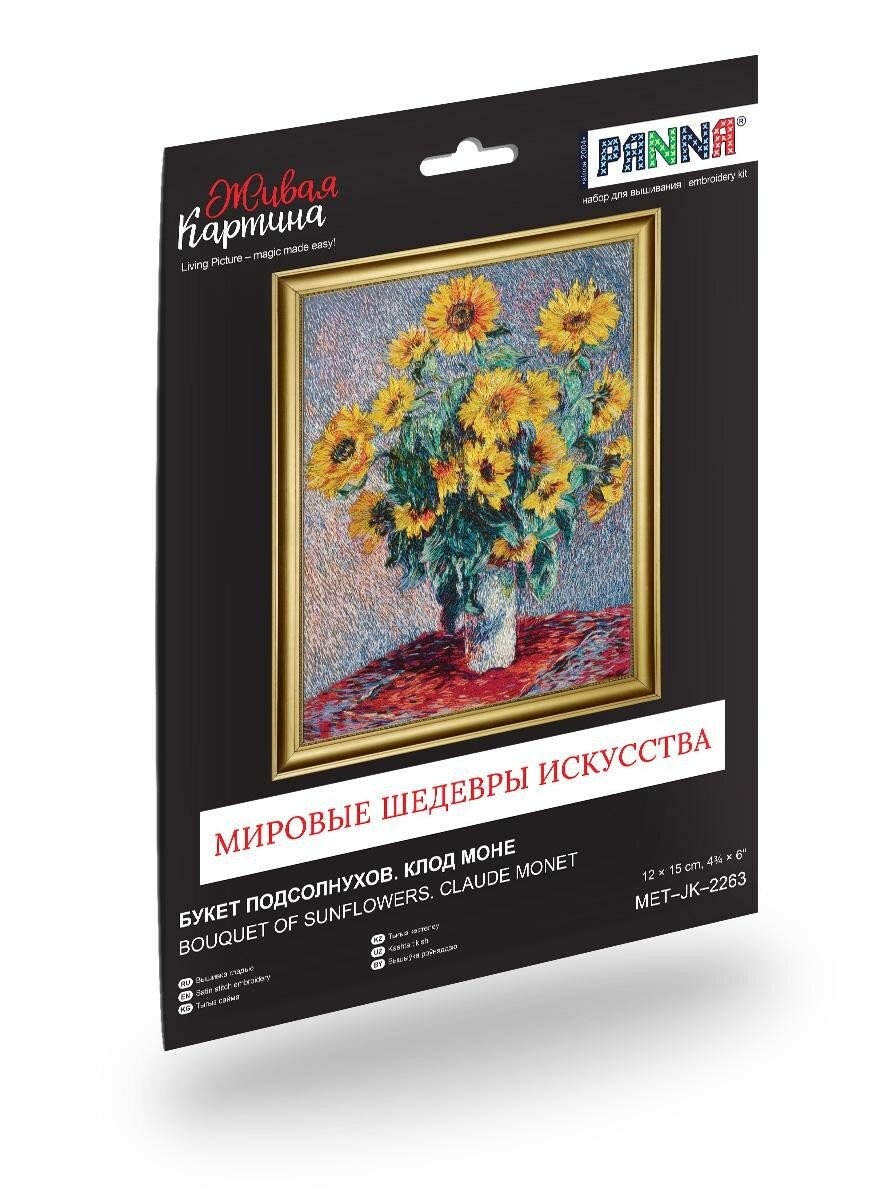 Набор для вышивания PANNA Живая картина MET-JK-2263 Букет подсолнухов Живая картина MET-JK-2263 Букет подсолнухов Новая коллекция наборов для вышивания в технике гладь от PANNA создана по мотивам Шедевров Мирового Искусства! В набор входит все необходимое: подробная инструкция по вышиванию, иллюстрации к инструкции, хлопковая ткань с напечатанным рисунком, х/б нитки мулине Gamma и иглы для вышивания Gamma.