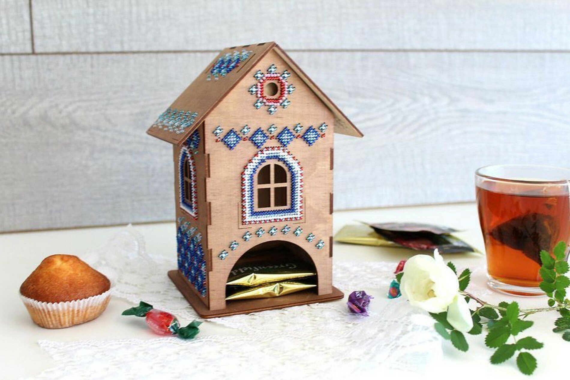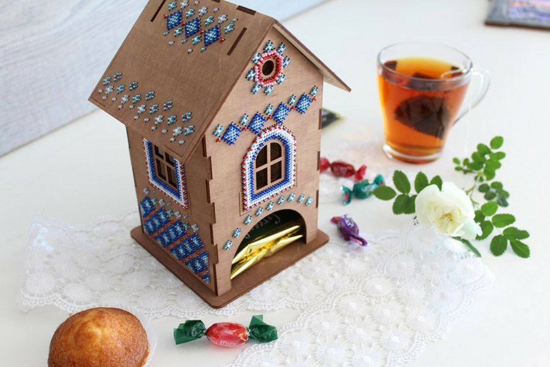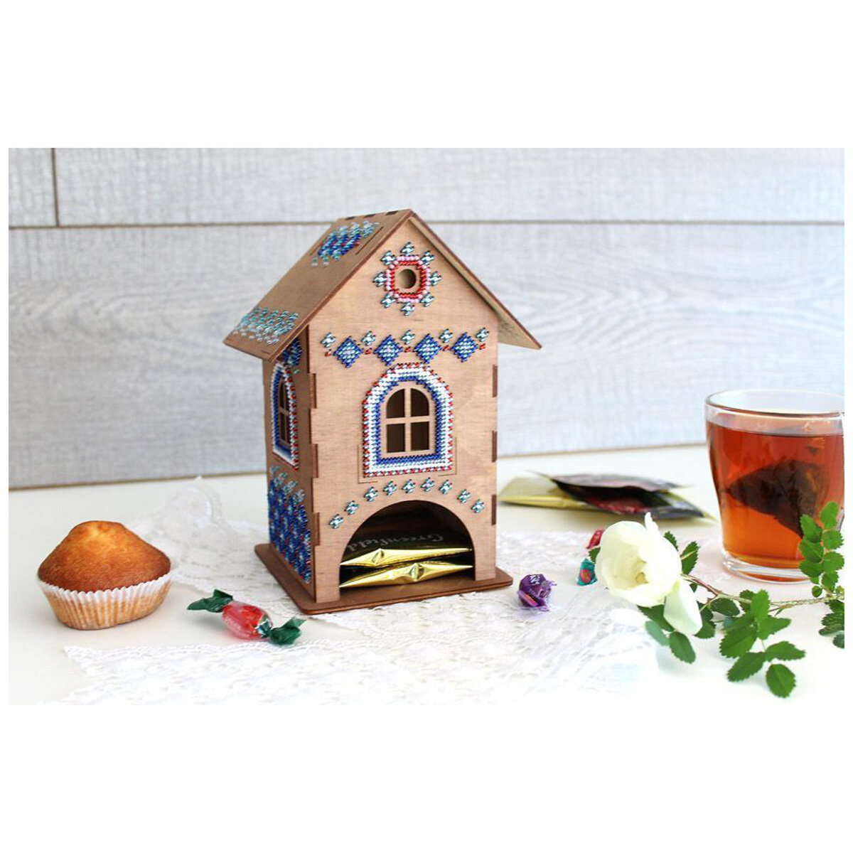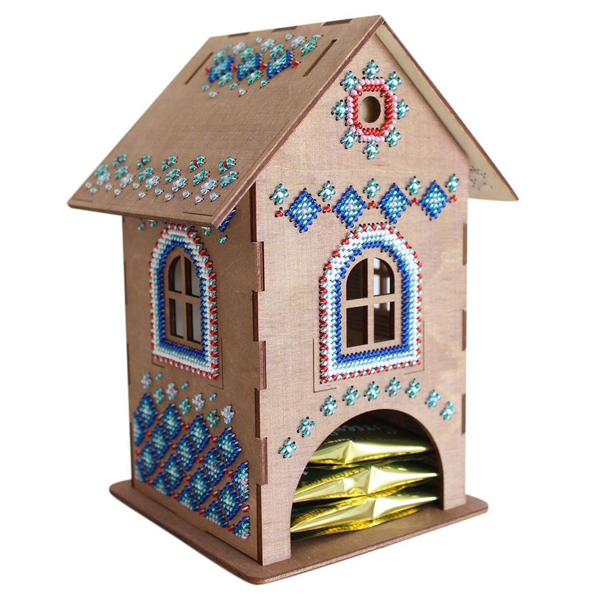 Создайте оригинальный сувенир с вышивкой бисером 'Чайный домик №1'. Для вышивки не потребуются даже пяльцы, достаточно владеть техникой 'косой стежок' и точно следовать инструкции. На фанере уже нанесена перфорация, поэтому стежки получатся аккуратными, с одинаковым наклоном. Готовый сувенир украсит кухню и станет уютной деталью семейного чаепития. Заготовка поставляется в разобранном виде, схема сборки прилагается в инструкции. Основа из фанеры не требует обязательной обработки, но при желании отдельные детали можно предварительно покрыть лаком или расписать акриловыми красками. Внимание: дождитесь, пока покрытие полностью высохнет, чтобы не повредить роспись и не испортить вышивку. В наборе: перфорированная тонированная основа из фанеры (состоит из 5 частей: основание, задняя часть), детали для крепления (2 шт.), бисер Preciosa, швейные нити, игла, двухцветная символьная схема, инструкция. Количество цветов: 6. Размер готового сувенира: 12х19х12 см.