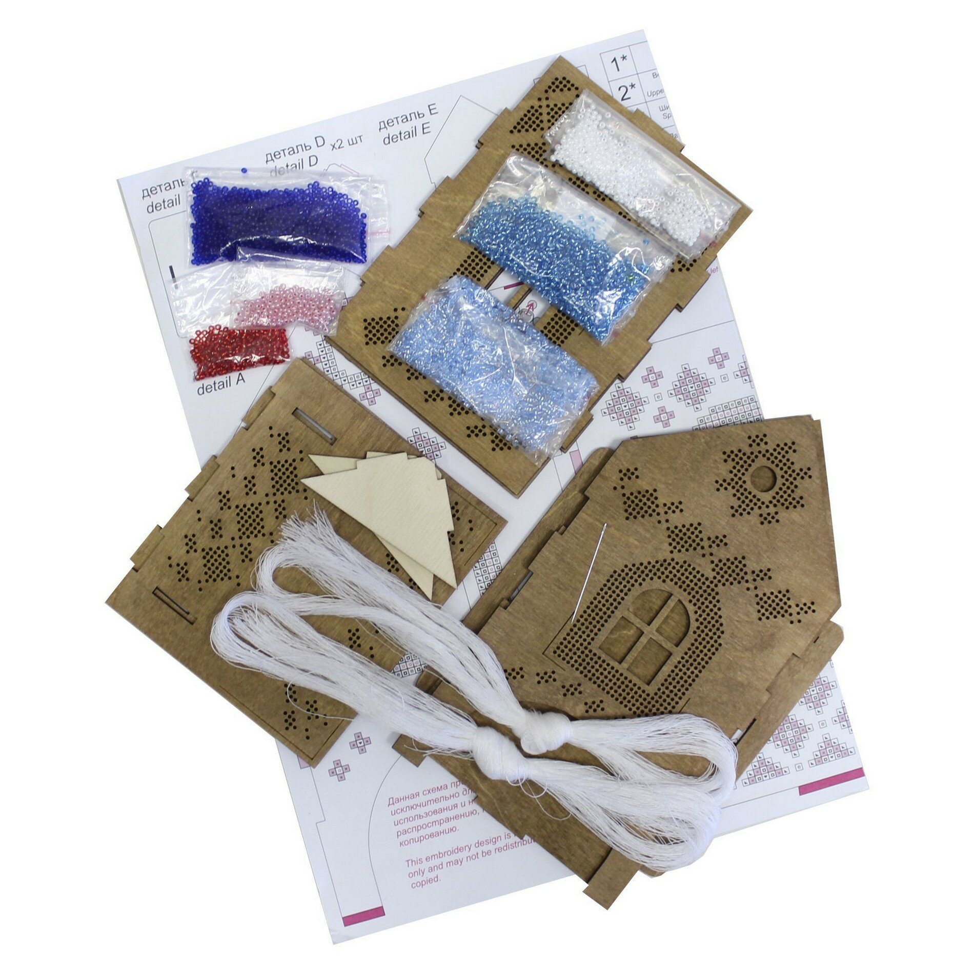 | В набор входит | тонированная перфорированная деревянная фанера: заготовка под вышивку (5 шт), задняя часть, основание, детали для крепления (2 шт), бисер Preciosa 6 цветов, игла, двухцветная схема и руководство по вышиванию |