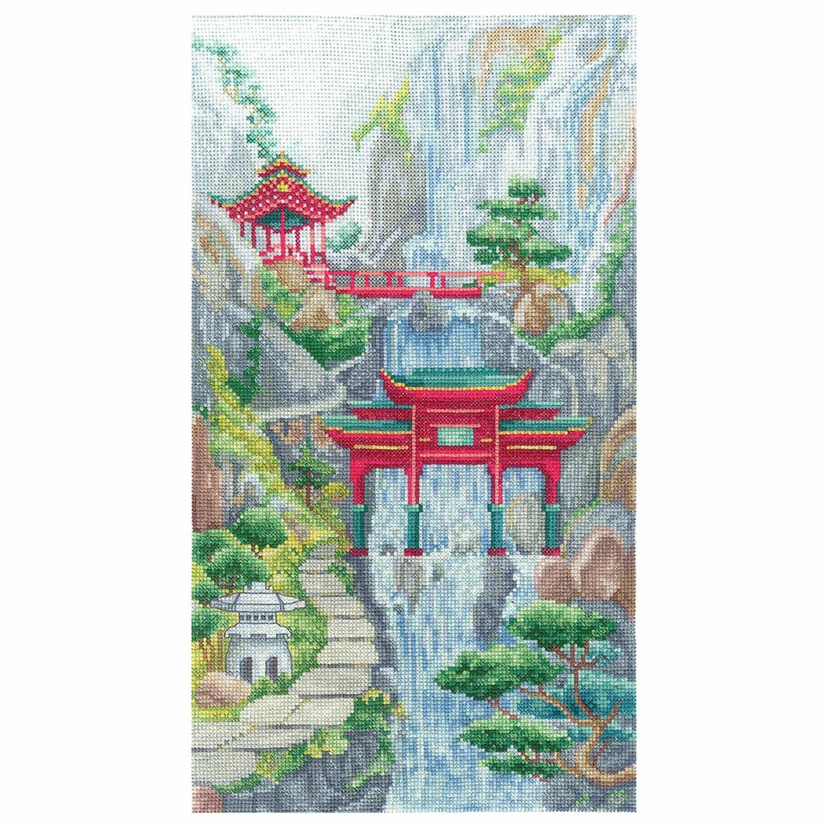 В наборе для вышивки крестом 'Врата водопада' используется канва Aida 16 каунта – этот материал позволяет выкладывать небольшие стежки и прекрасно подходит для схем с подробной детализацией.