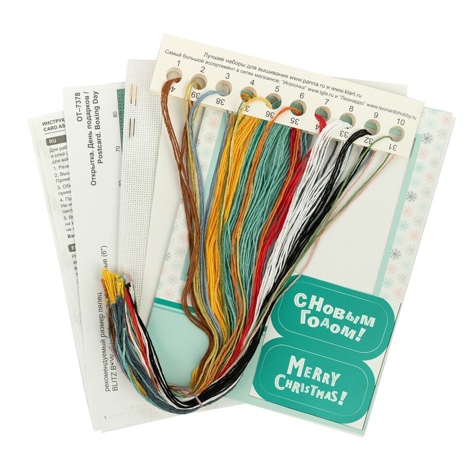 | Комплектация | аппертированная канва Gamma Aida 18; хлопчатобумажные нитки мулине Gamma; игла для вышивания Gamma; паспарту для оформления открытки; клеевой вкладыш А5 для оформления открытки; поздравительные стикеры для паспарту на двух языках; цветная схема и инструкция |
