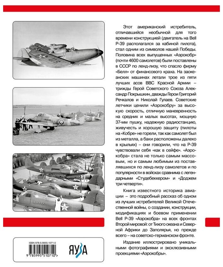 Замечательная книга. Но описания боев на Аэрокобре А.И.Покрышкина, Г.А.Речкалова, А.Ф.Клубова и других наших выдающихся асов, воевавших на данном истребителе, явно не хватает. Их воспоминания и отзывы об Аэрокобре существенно улучшили бы данную работу.