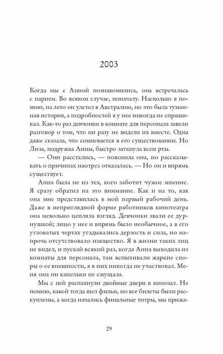 Анна и Ник познакомились, устраиваясь на сезонную летнюю работу в кинотеатре. Нику двадцать два года, Анне - девятнадцать. Ник серьезный и рассудительный, Анна непредсказуемая и загадочная: она выросла в семье, где все готовятся к концу света, поведение каждого жестко контролируется, а курение, выпивка и секс до свадьбы запрещены и строго караются.