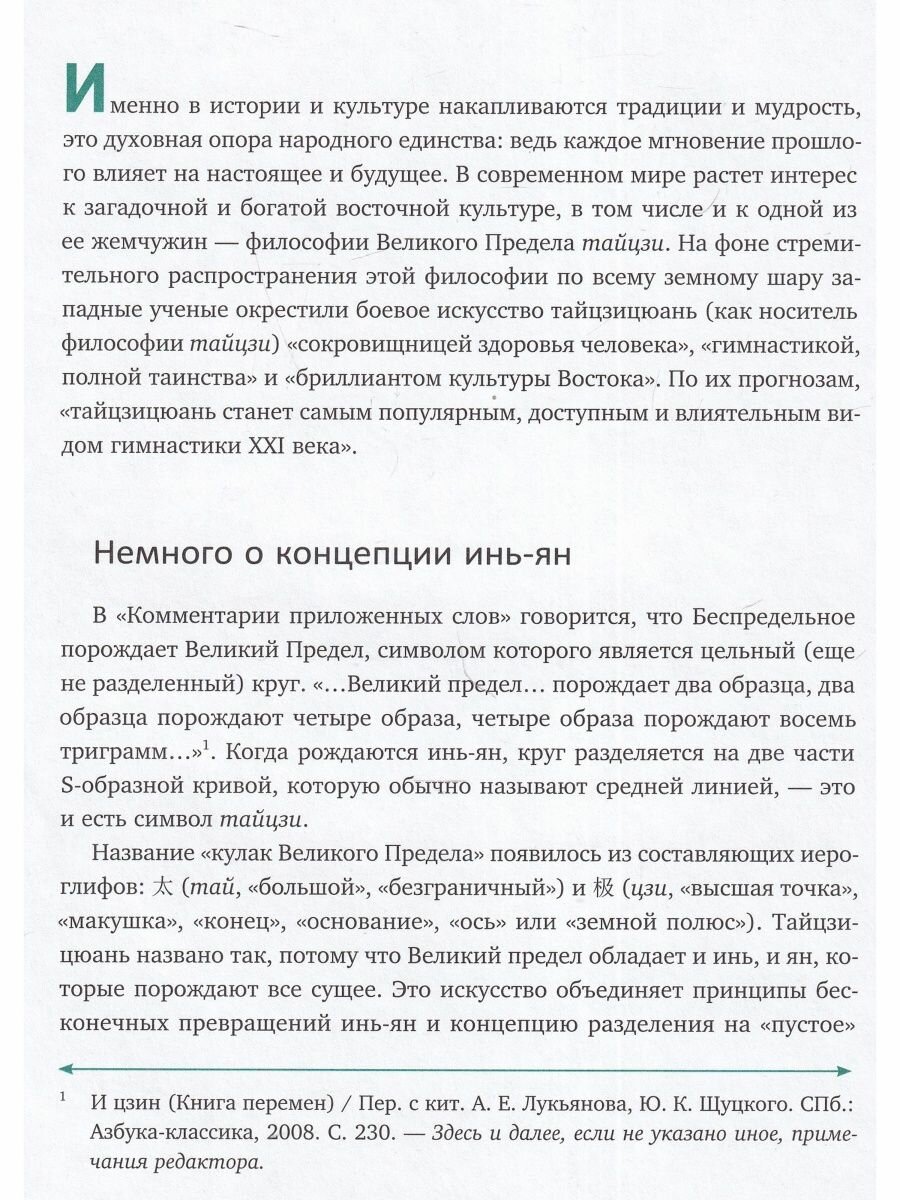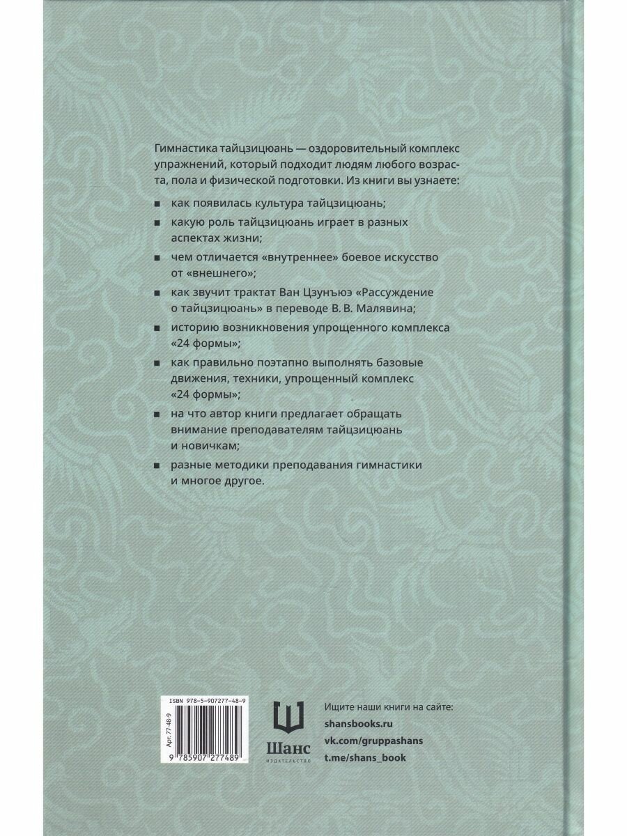 Эта книга посвящена истории возникновения и развития оздоровительной гимнастики тайцзицюань. Опираясь на классические тексты, а также философию тайцзи и концепцию инь-ян, автор рассказывает об основных движениях и положениях известной по всему миру гимнастики. Бай Шупин описывает методики преподавания тайцзицюань новичкам, рассказывает о возможных ошибках и травмах во время занятий, а также приводит способы их предотвращения.