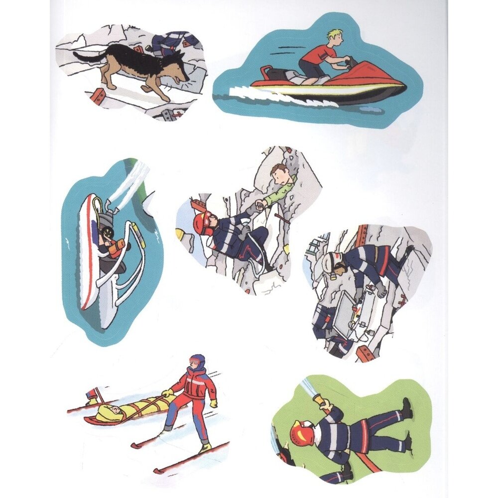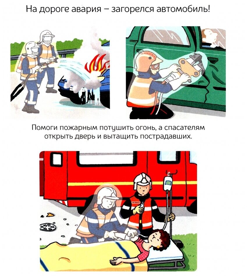 При пожарах, авариях и других несчастных случаях на помощь людям приходят пожарные и спасатели. Посмотри, как они действуют в экстренных ситуациях и какие средства и оборудование применяют в своей работе. Подбери для каждого случая нужные наклейки.