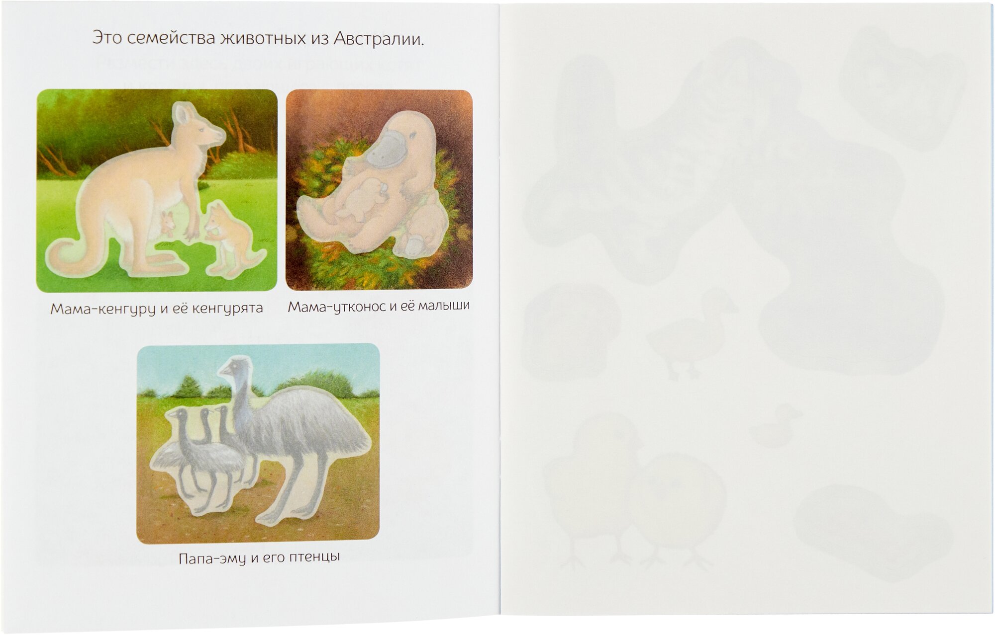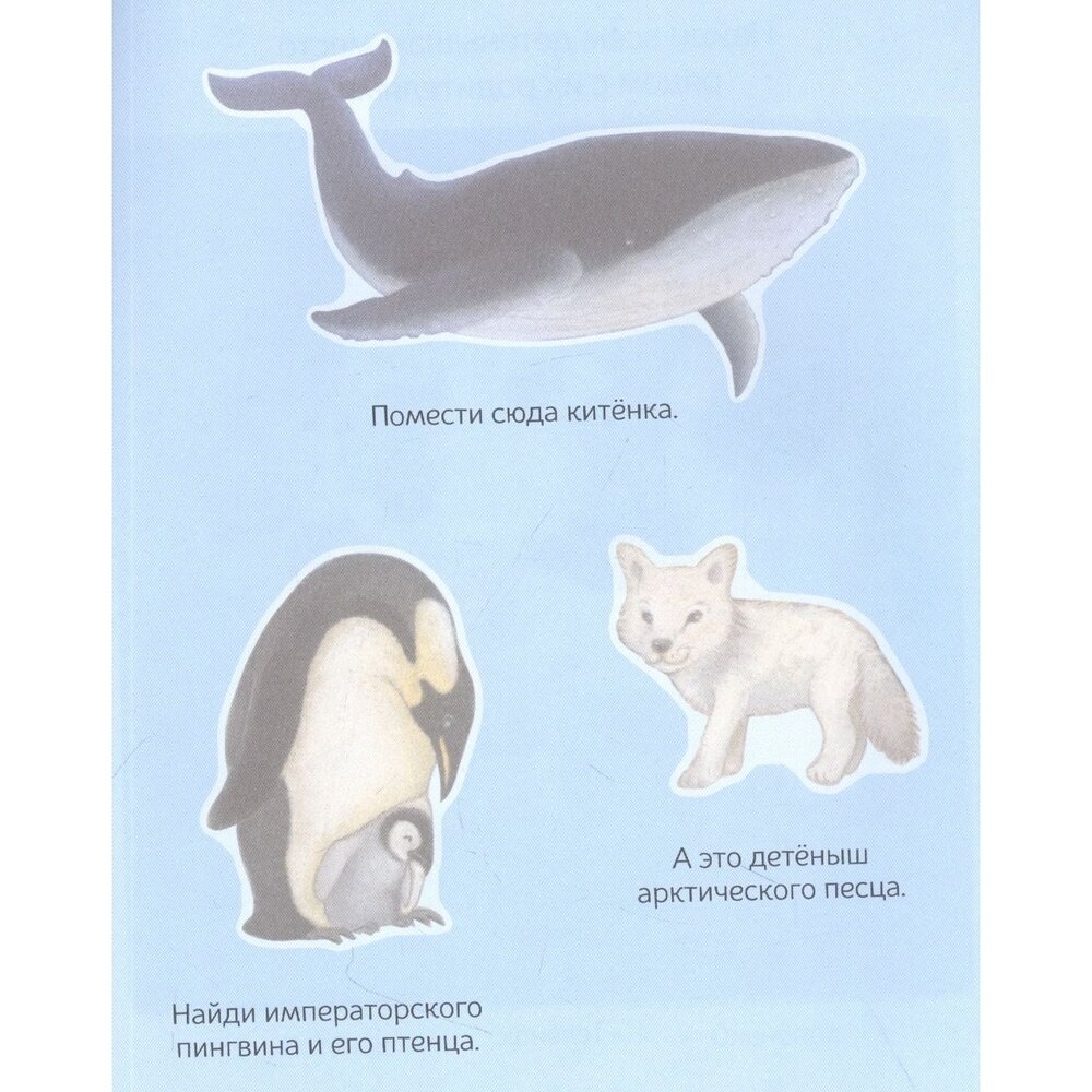 В воде и на суше обитает множество разных животных и их детёнышей. Посмотри, как они выглядят и называются, и узнай, кто из них живёт на заливном лугу, на ферме, в жаркой саванне, среди снега и льда и в океане. Найди место для каждого малыша, используя яркие наклейки!