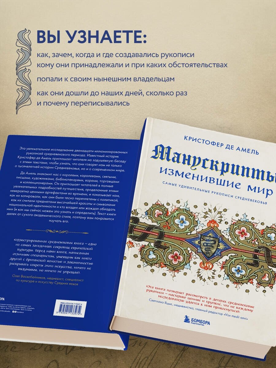 Гораздо больше, чем просто книга о манускриптах. Это необыкновенное и прекрасно иллюстрированное исследование средневекового мира через двенадцать рукописей от одного из ведущих мировых экспертов, британского академика Кристофера де Амеля. Отчасти книга о путешествиях, отчасти детективная история, отчасти беседа с читателем, "Манускрипты, изменившие мир" позволяет нам познакомиться с некоторыми из величайших произведений искусства в нашей культуре и по-новому взглянуть на историю и на то, как мы получаем знания. От самой ранней книги средневековой Англии до несравненной Келлской книги и древнейшей рукописи Кентерберийских рассказов, эти манускрипты повествуют об эволюции духовной культуры и искусства на протяжении целого тысячелетия.