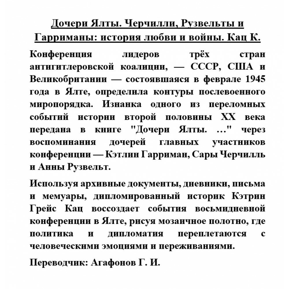 На сегодняшний день товар «Книга: Дочери Ялты. Черчилли Рузвельты и Гарриманы: история любви и войны (Кэтрин Грейс Кац); Издательство АСТ, 2020» можно купить с кешбеком в 5 магазинах: book24, Буквоед, Читай-город, Яндекс.Маркет, ЛитРес