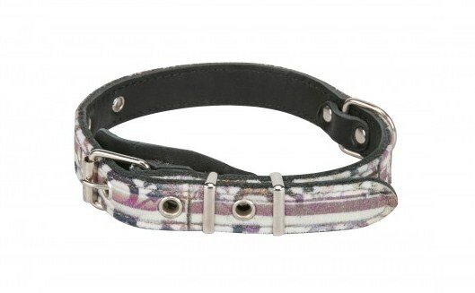 Ошейник для собак кожаный с декоративной текстильной отделкой. Нижний слой — натуральная кожа, верхний слой — ткань, декоративная строчка, сварное полукольцо. Изысканный дизайн.