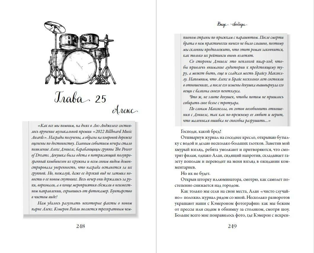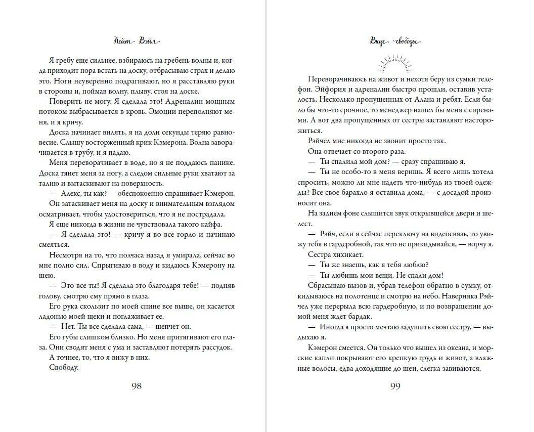 Дебютный роман перспективной российской писательницы Кейт Вэйл! Для всех фанатов Эммы Скотт, Л. Дж. Шэн и Тилли Коул! "Вкус свободы" - история любви известной барабанщицы и серфера-экстремала! Роман о любви к жизни, потере, поиске себя и об отношениях с близкими. Чувственно, искренне и горячо!