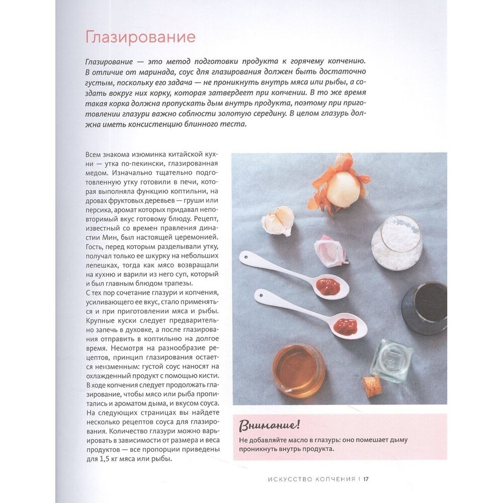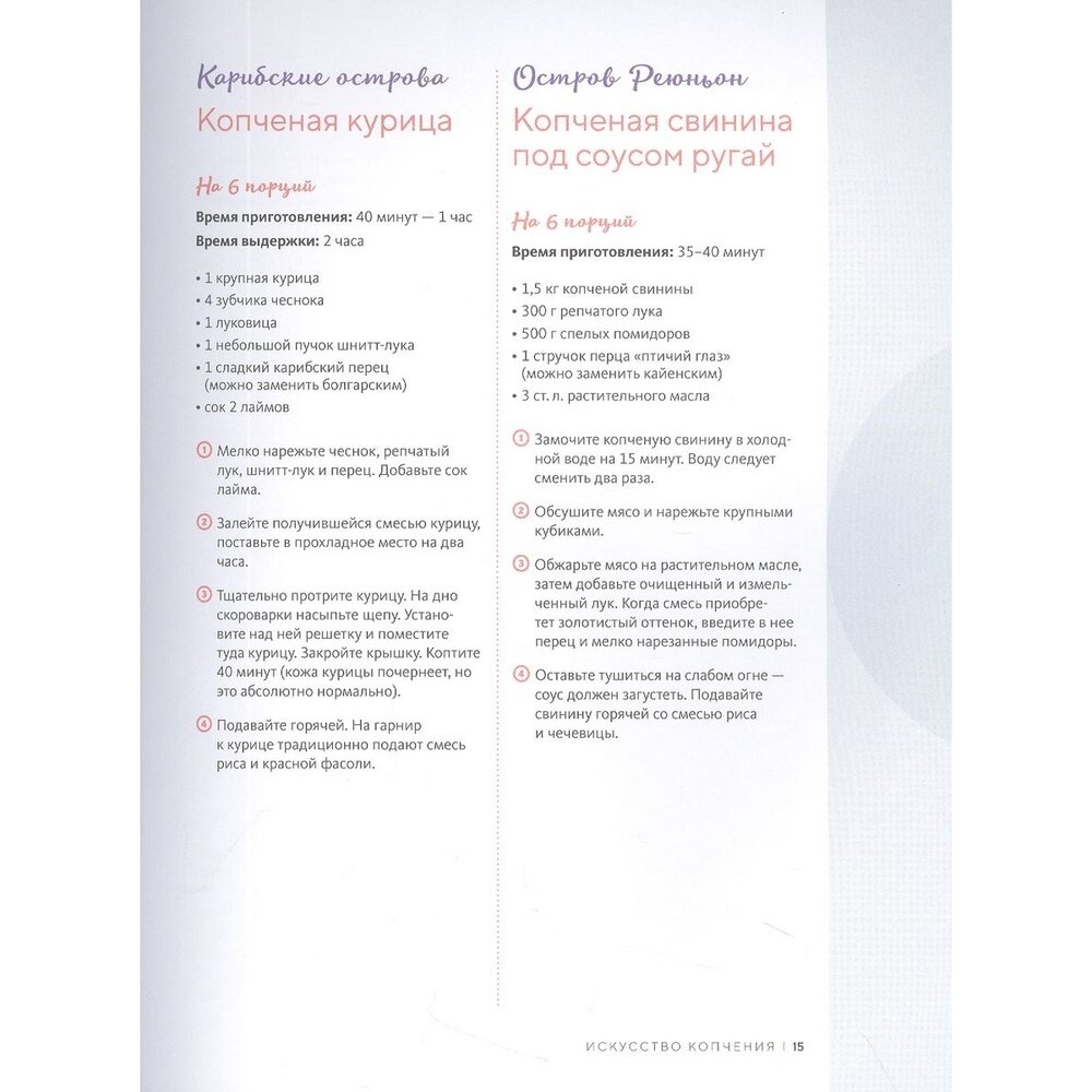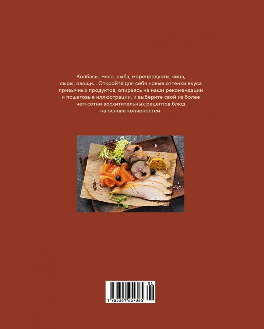 Копченая утиная грудка с душистым перцем, шашлык из копченых говяжьих щечек, холодец с копченым окороком и брокколи, пирог из блинного теста с копченой рулькой и шнитт-луком, рулет из копченой печени со шпинатом, карпаччо из копченого лосося, копченые баклажаны и зеленый горошек… насладитесь новыми вкусовыми оттенками любимых блюд! В этой книге вы найдете основные техники копчения, а также яркие рецепты, сгруппированные по типам продуктов: говядина, свинина, птица и крольчатина, рыба и морепродукты. Кроме того, узнаете нюансы малоизвестной, но любопытной техники копчения сыров и овощей.