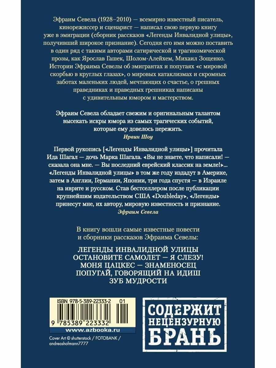 Эфраим Севела (1928-2010) - всемирно известный писатель, кинорежиссер и сценарист - написал свою первую книгу уже в эмиграции (сборник рассказов "Легенды Инвалидной улицы", получивший широкое признание). Сегодня его имя можно поставить в один ряд с такими авторами сатирической и трагикомической прозы, как Ярослав Гашек, Шолом-Алейхем, Михаил Зощенко. Истории Эфраима Севелы об эмигрантах и попугаях "с мировой скорбью в круглых глазах", о мировых катаклизмах и скромных заботах маленьких людей, мечтающих о счастье, о грешных праведниках и праведных грешниках написаны с удивительным юмором и мастерством. В настоящее издание вошли самые известные повести и рассказы Эфраима Севелы.