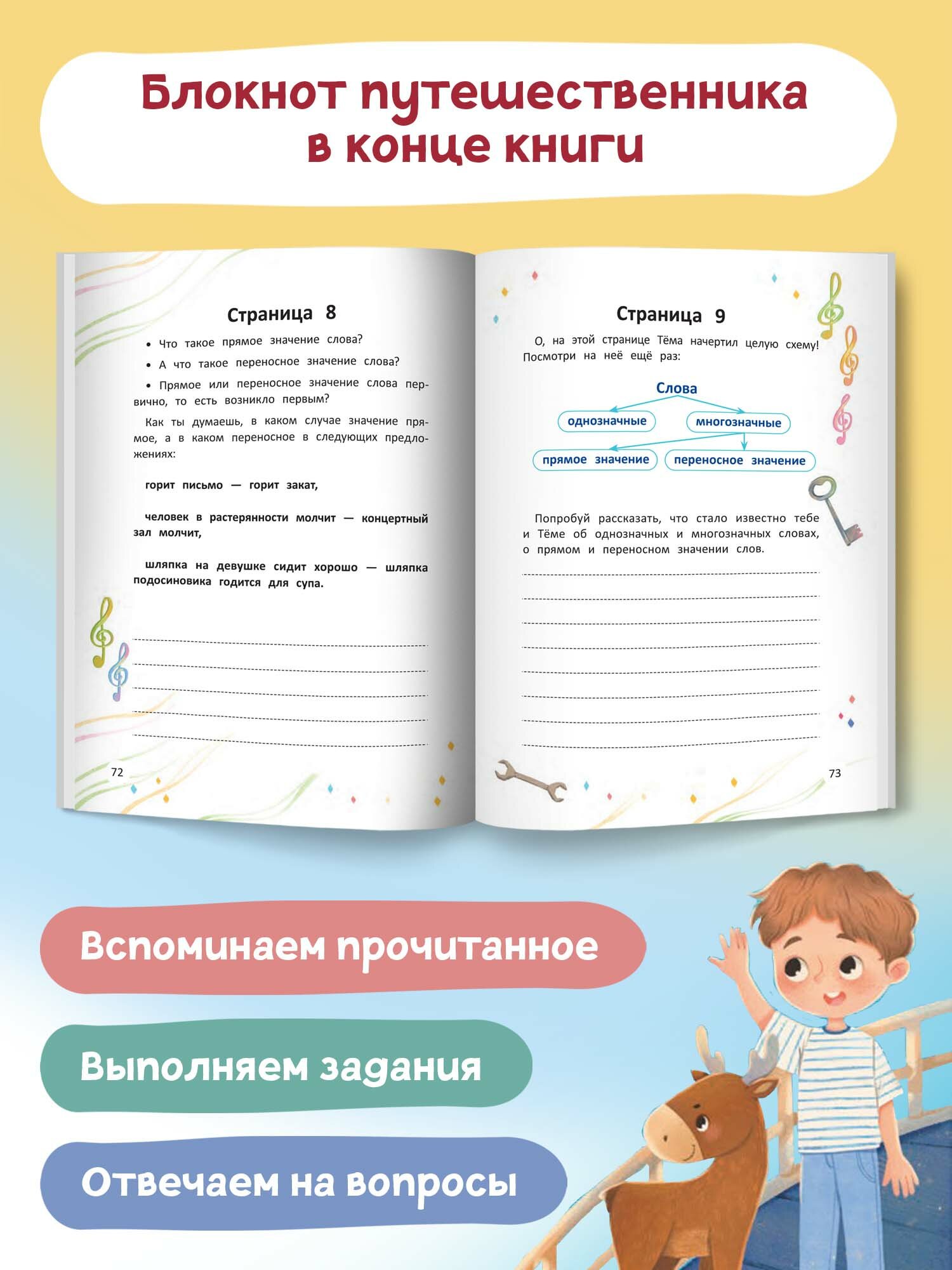 Русский язык вписан в обучающую сказку. Герой книги, Тёма, из главы в главу познаёт мир русского языка, путешествуя по волшебной стране на загадочном транспорте. У него появляется попутчик - лосёнок, которого Тёма спас от медведя. В дороге преодолевать трудности им помогают ударение, твёрдость и мягкость согласных, падежи, прямое и переносное значение слов, однозначные и многозначные слова, паронимы, антонимы и многое другое.