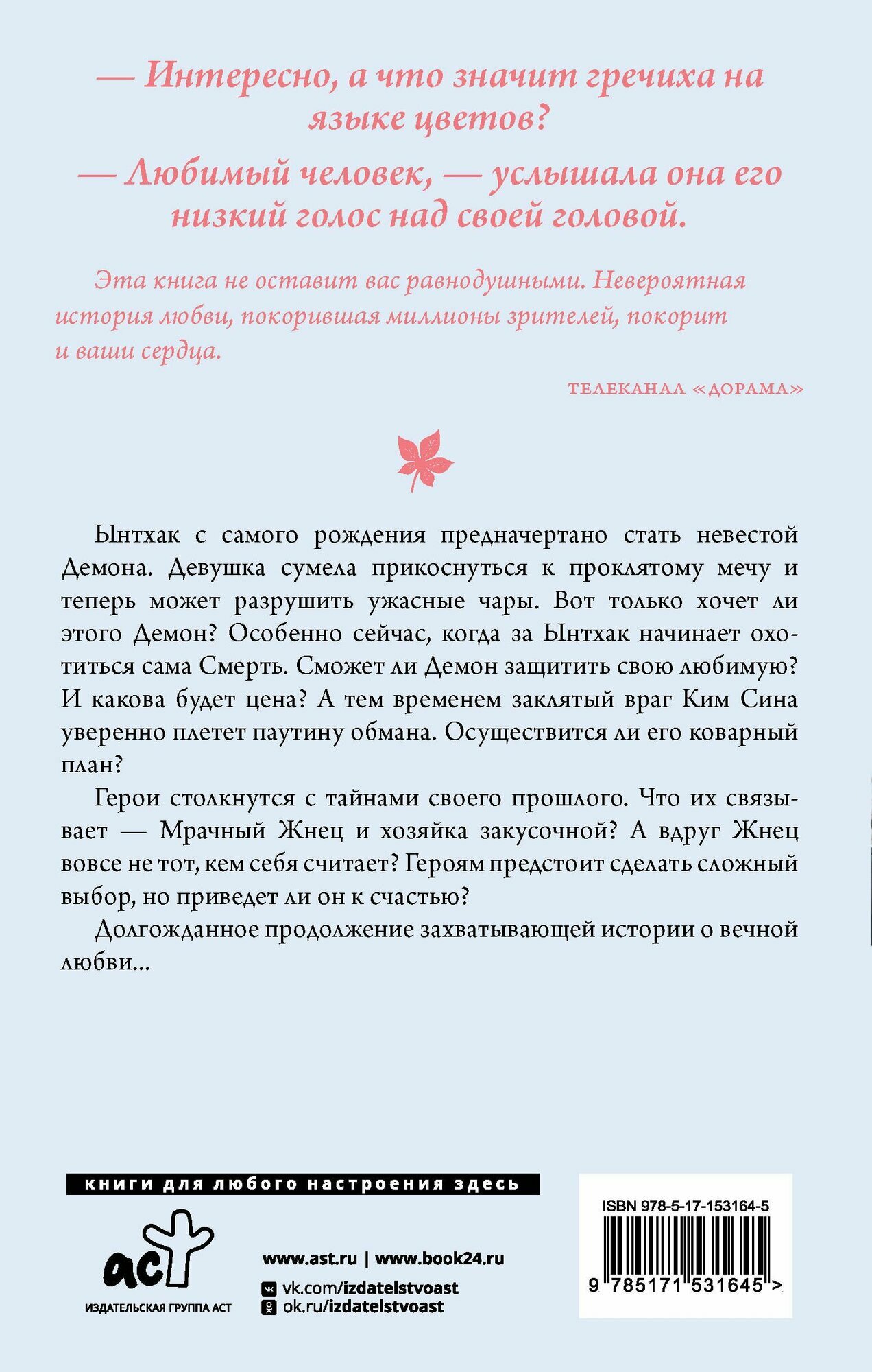 Переиздание (эта обложка мне больше нравится) второй части истории о Токкэби/Гоблине/Демоне и его невесте. В этой половине больше раскроют персонажей, в том числе Мрачного жнеца, сестру Токкэби, и саму главную героиню. Любимая дорама - милая, романтичная, но финал вышел очень... болезненным, сильным, без слез никак не обойдется, если зацепила эта история. В целом, книга - приятное дополнение к дораме, особенно для фанатов, коим я и являюсь.