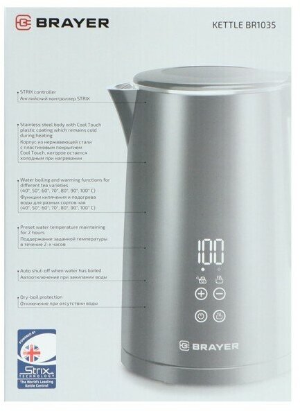 | Прочие особенности и свойства | Английский контроллер STRIX., Сенсорное управление., Функции кипячения и подогрева воды для разных сортов чая (40°, 50°, 60°, 70°, 80°, 90°, 100° С)., Поддержание заданной температуры в течение 2-х часов. |