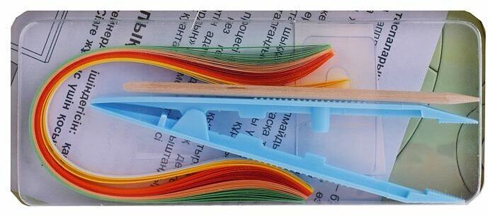 В набор входит: комплект цветных бумажных лент для квиллинга, деревянный стик, основа-иллюстрация, пластмассовый пинцет, крючок для подвешивания, рамка.