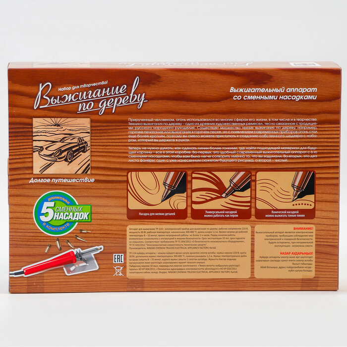 Теперь не нужно думать, как сделать линии более тонкими, где найти подходящий материал для будущей картины - все в этой коробке, Во-первых, это удобный современный выжигательный аппарат с 6 сменными насадками, чтобы вам было легче сотворить именно то, что вы задумали. Во-вторых, это два листа фанеры: один с уже нанесенным сюжетом будущего рисунка, а второй - чистый.