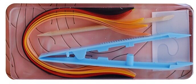 В набор входит: комплект цветных бумажных лент для квиллинга, деревянный стик, основа-иллюстрация, пластмассовый пинцет, крючок для подвешивания, рамка.