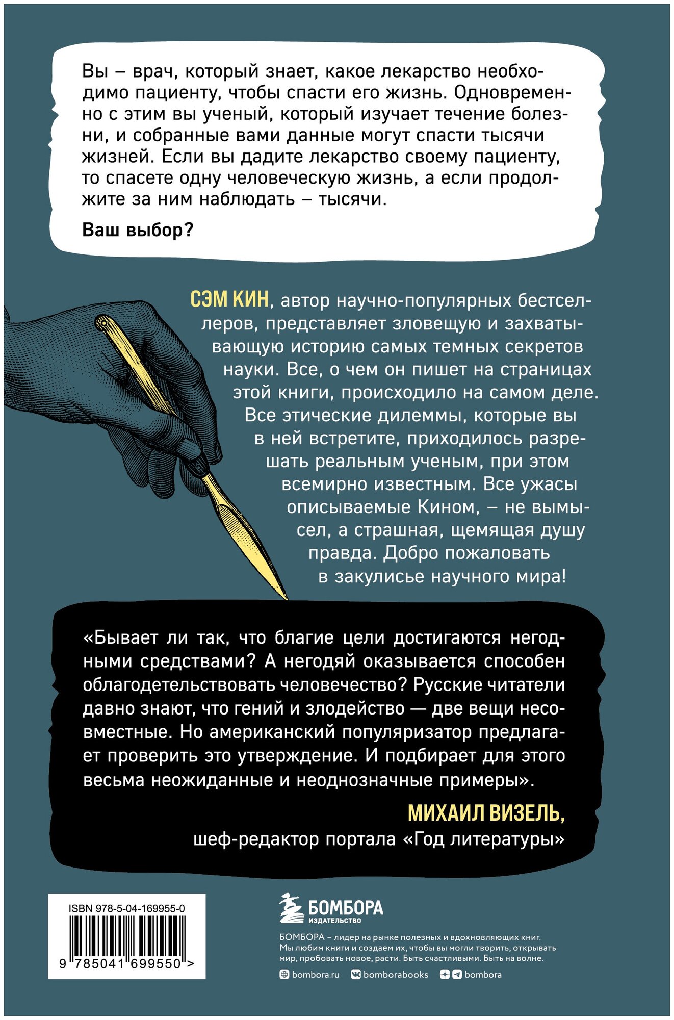 Ваш выбор? Сэм Кин, автор научно-популярных бестселлеров, представляет зловещую и захватывающую историю самых темных секретов науки. Все, о чем он пишет на страницах этой книги, происходило на самом деле. Все этические дилеммы, которые вы в ней встретите, приходилось разрешать реальным ученым, при этом, всемирно известным. Все ужасы, описываемые Кином — не вымысел, а страшная, щемящая душу правда. Добро пожаловать в закулисье научного мира!