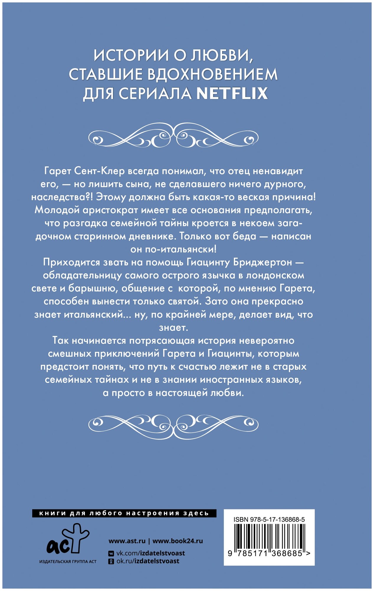 Книга посвящена любовной истории самой младшей из семейства Бриджертонов- Гиацинта, которая знакомится с обаятельным аристократом Гаретом Сен-Клером. А обращается он к девушке с просьбой помощи в переводе дневника на итальянском языке. Так что тут не просто романтика, страсть и тому подобное, но и поиск сокровищ, мнтриги, расследование тайн прошлого...