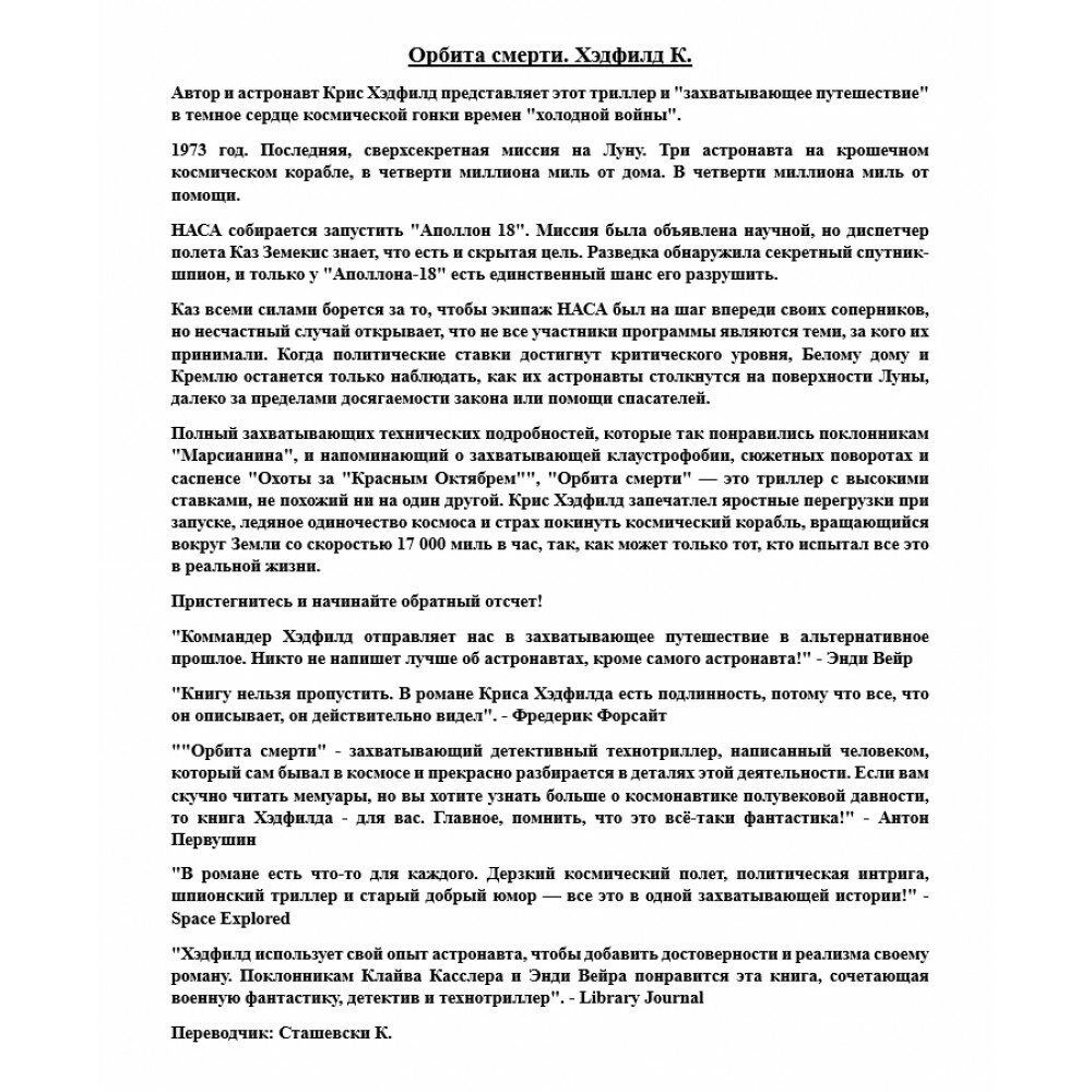 Безусловно, “Орбита смерти” – достойный подарок для всех поклонников космоса. И кажется, что из-под пера настоящего астронавта должна была бы выйти неплохая научная фантастика, а получилась не только она: по настроению это 100%-ный триллер с немного тревожной атмосферой. У тревоги этой два источника – бескрайние и пугающие просторы космоса и зарождающееся предательство. США и СССР находятся в состоянии “холодной войны” и три астронавта готовятся к миссии “Аполлон-18”. Но уже в космосе они узнают, что один из них – шпион, и далеко от Земли разыгрывается смертельно опасная игра. Подробности, с которыми пишет Хэдфилд, ни капли не заставляют сомневаться в реальности происходящего. И в конце книги он рассказывает, что (и кто) из упомянутого в книге было реально, а что – вымысел. И нужно быть готовым к довольно большому количеству технических подробностей, они нисколько не мешают сюжету, но кого-то могут оттолкнуть. Понятное дело, что астронавт с таким стажем не смог бы совсем без них обойтись – но это скорее преимущество книги, а не недостаток.