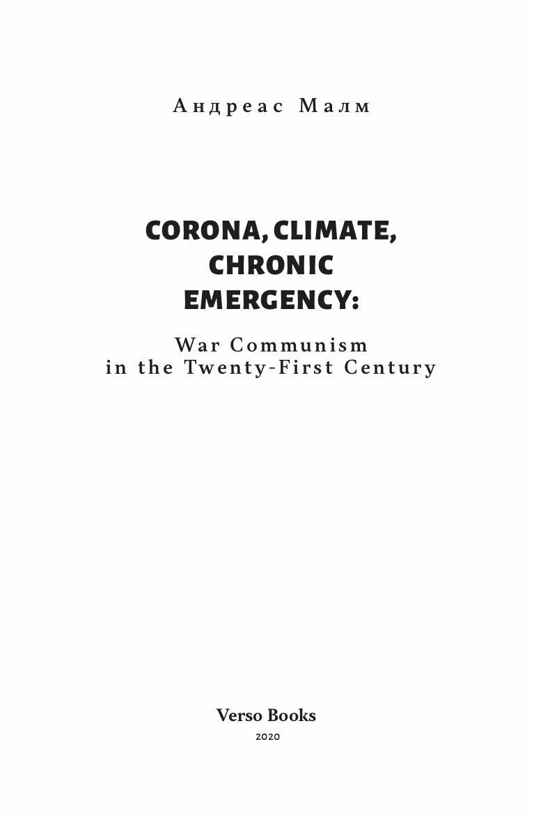 Корона климат хроническая чрезвычайная ситуация. Военный комунизм в XXI веке (Андреас Малм); Издательский дом «Городец», 2020