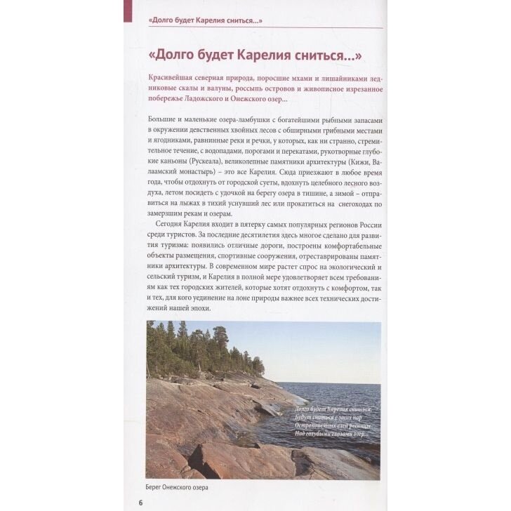 Сегодня Карелия – это не только Петрозаводск с его музеями и великолепной набережной, не только острова Кижи и Валаам, не только другие памятники истории и архитектуры. Сегодня здесь каждый найдет занятие по душе. Любители активного отдыха смогут покататься на байдарках и горных лыжах, поплавать в море с белухами, взять уроки у специалистов-дайверов, съездить в гости к карельскому деду Морозу, познакомиться с хаски, «полетать» над мраморным карьером «Рускеала», который пользуется в последнее время огромной популярностью. Тех, кто делает выбор в пользу тишины и уединения, ждет старейший курорт «Марциальные воды», многочисленные гостиницы и кемпинги, расположенные на берегах величественных озер.