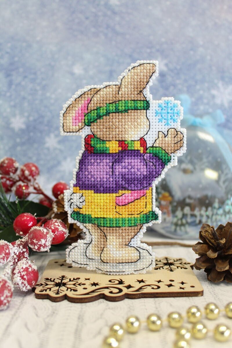 Создайте яркий вышитый сувенир Зайка со снежинкой – это увлекательно и просто, достаточно владеть техникой крест и точно следовать инструкции. Пяльцы или рамки не понадобятся – пластиковая канва отлично держит форму. Готовые элементы надо вырезать по контуру и соединить между собой аккуратными стежками. При желании между деталями игрушки можно вклеить или вшить ленту-подвес. В наборе: пластиковая канва 14 ct, хлопковое мулине ПНК им.Кирова, игла, схема, инструкция. Количество цветов: 19. Размер готового сувенира: 8х13 см.