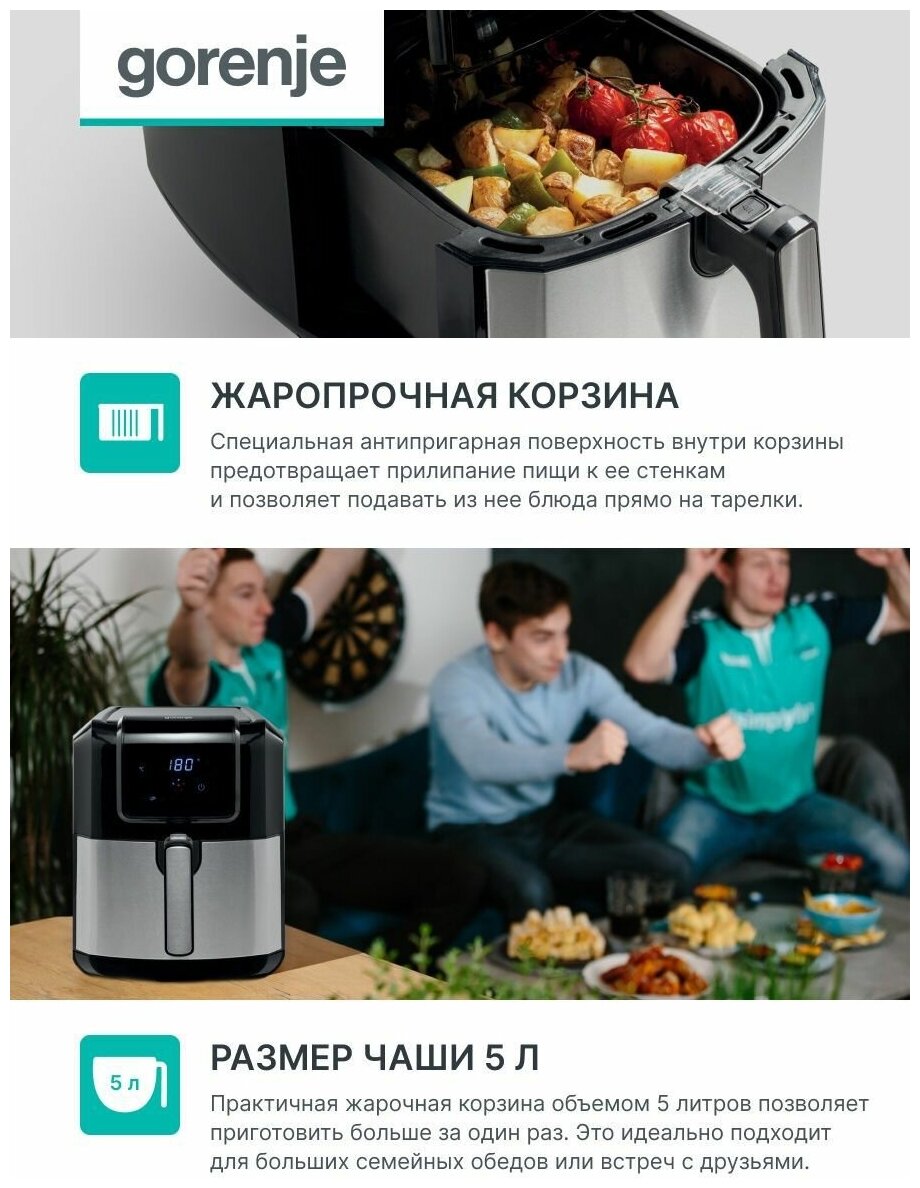 Аэрогриль Gorenje AF1700DB обеспечивает приготовление вкусной здоровой пищи. Процесс приготовления осуществляется благодаря формированию циркулирующего потока горячего воздуха и равномерному распределению тепла. Данная модель оснащена 8 автоматическими программами с оптимальными температурными настройками. На панели управления с цифровым сенсорным дисплеем позволяется устанавливать время приготовления, температуру и степень зажаривания. Gorenje AF1700DB оснащена чашей из жаростойкого материала объемом 5 л, в которой за один раз можно готовить блюда для большой семьи.